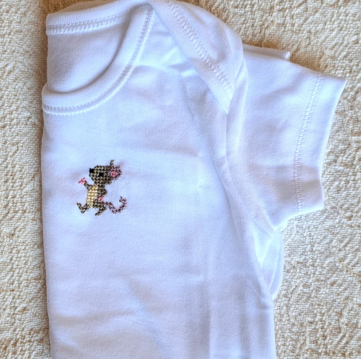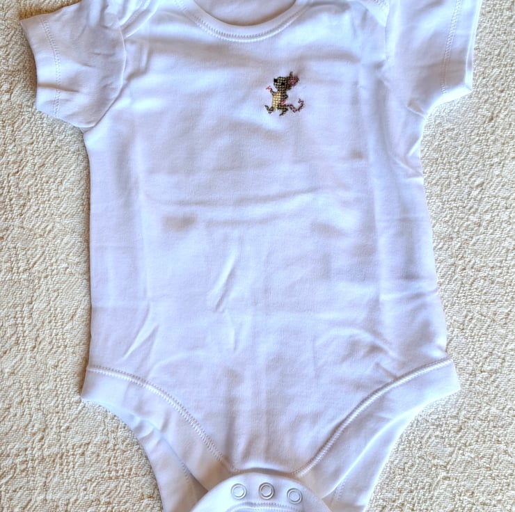 This is a sweet little white, short-sleeved baby vest or onesie, with an envelope neck and three press studs between the legs. I have hand embroidered a cheerful little brown mouse on it. As I never use a permanent backing material when hand embroidering kids' clothing, there is nothing inside to irritate your child's skin. The vest is 100% cotton and machine washable.