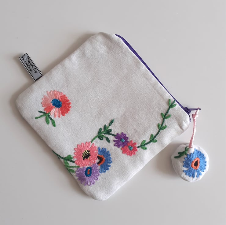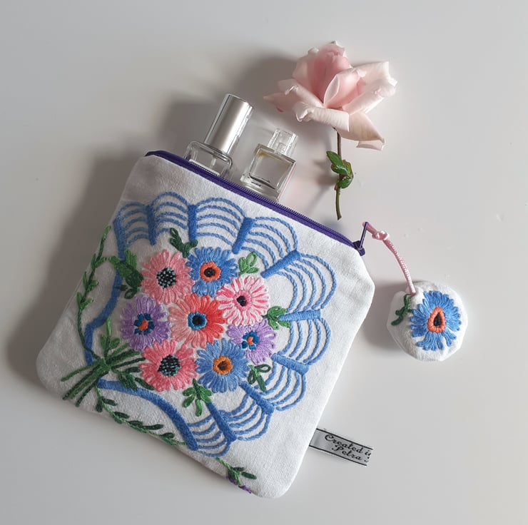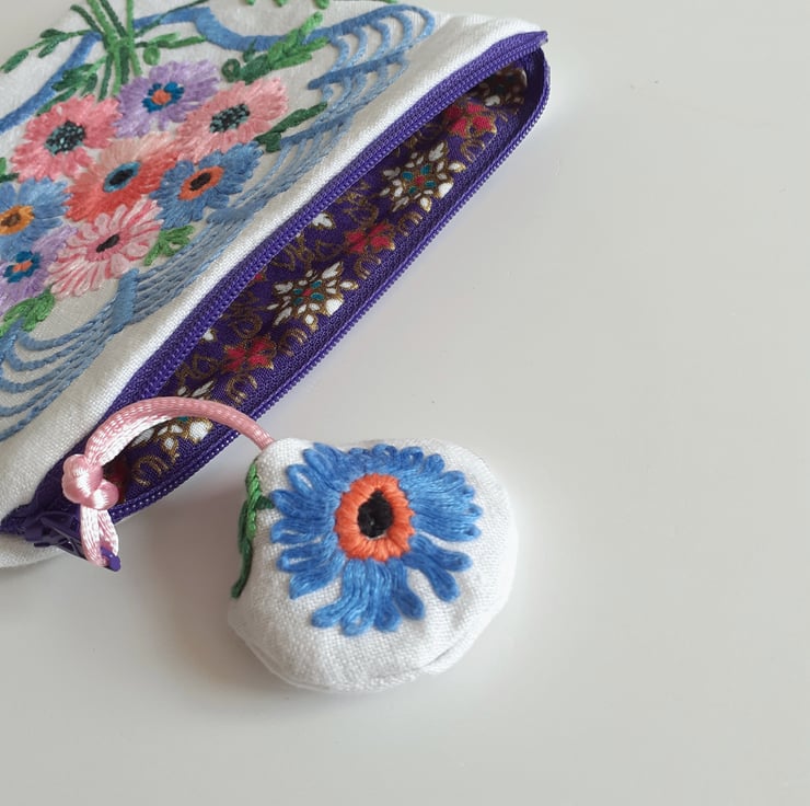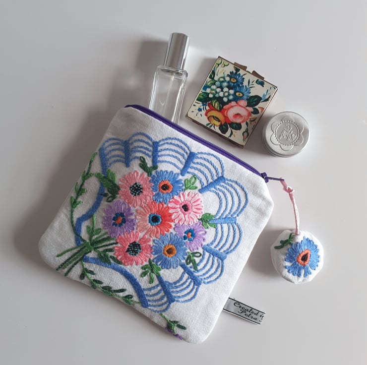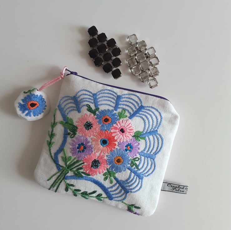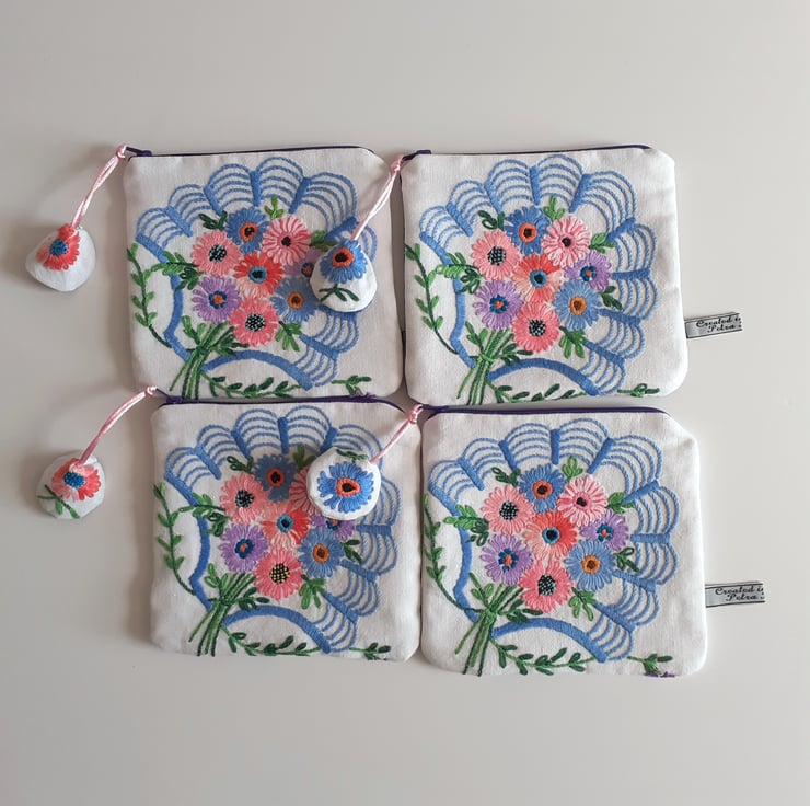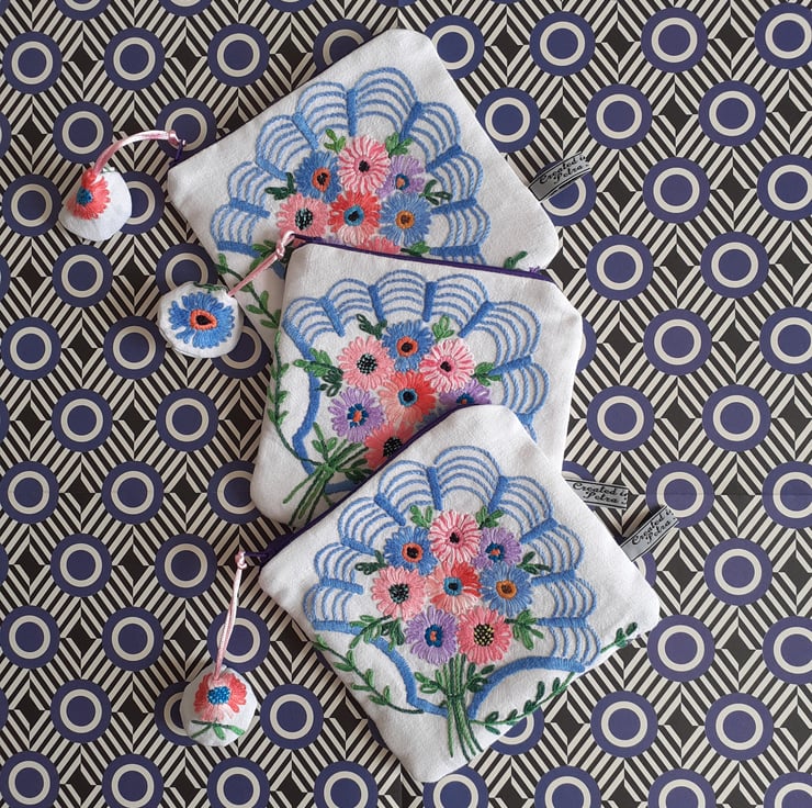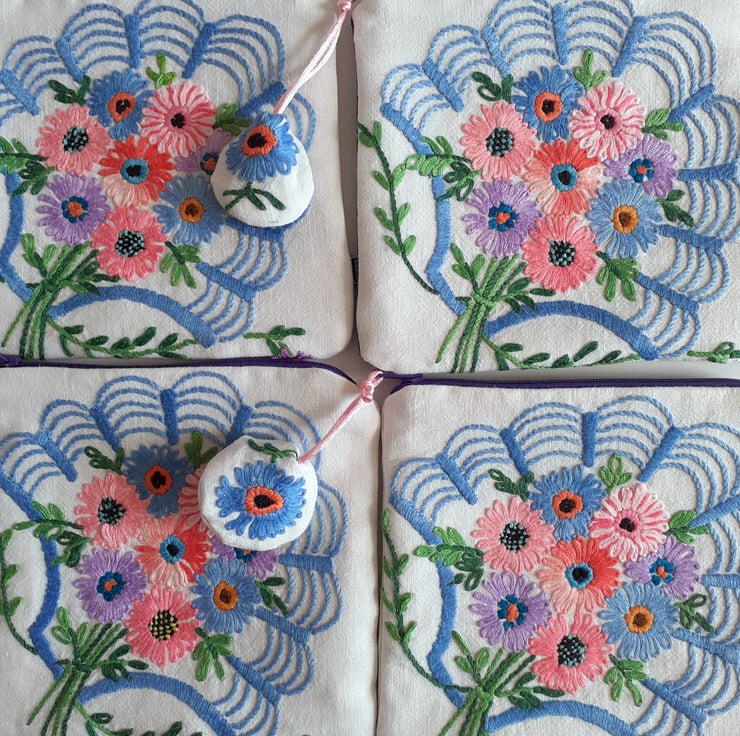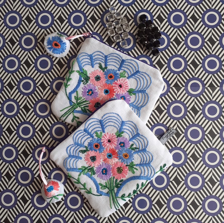 This pretty make up bag or purse is upcycled from vintage embroidery, once a thread bare 1940s tablecloth. Each corner has been stitched to make four pretty bags, edged with a shell motif, in an art deco style.