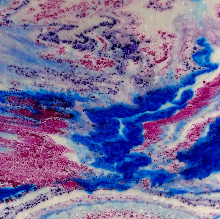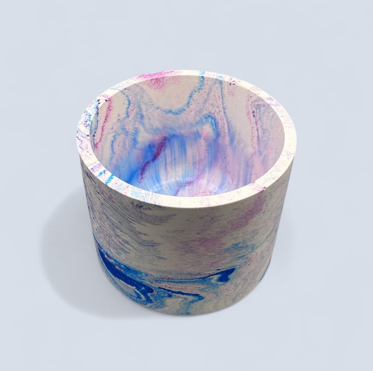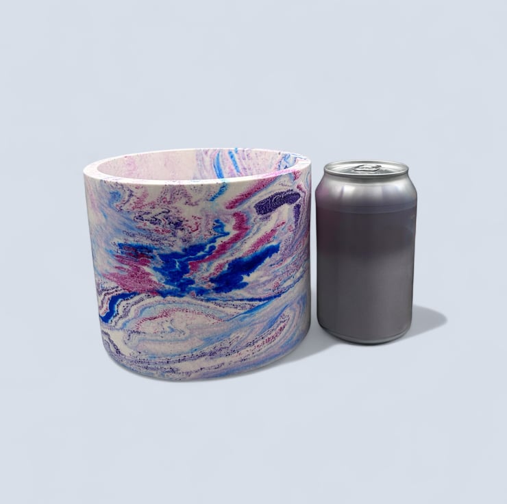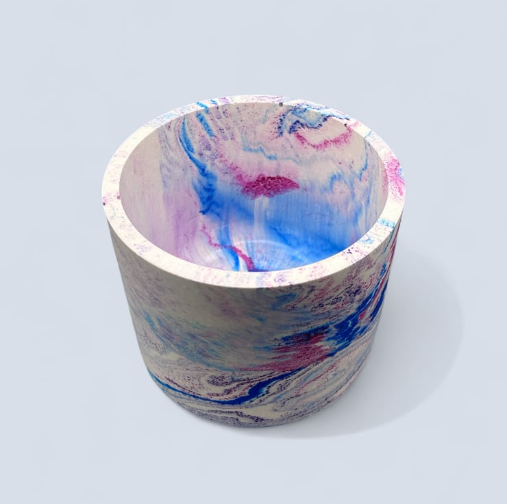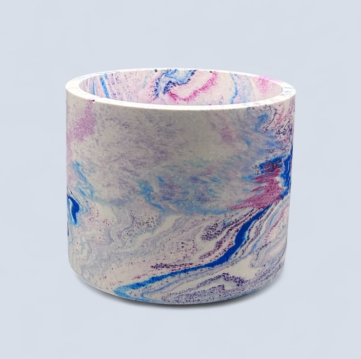 I created this pot after experimenting with bright swirling colours. The mix of blue pink and purple reminded me of watercolour ink spreading through water, forming soft flowing patterns that never repeat. I wanted to capture that sense of gentle movement in a piece that feels uplifting and expressive. This pot grew from that moment, a simple shape with a bold marbled pattern designed to bring a little burst of colour to a shelf desk or windowsill.