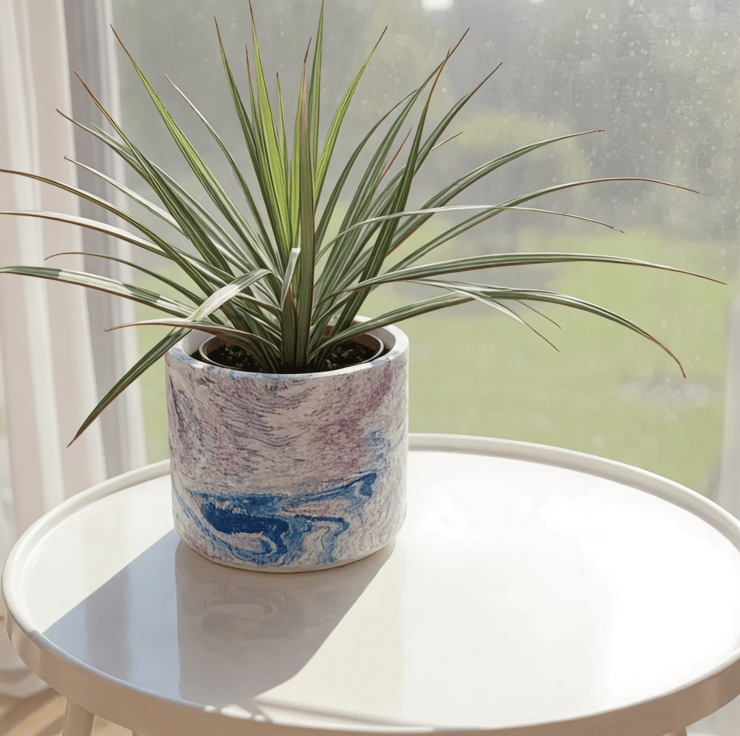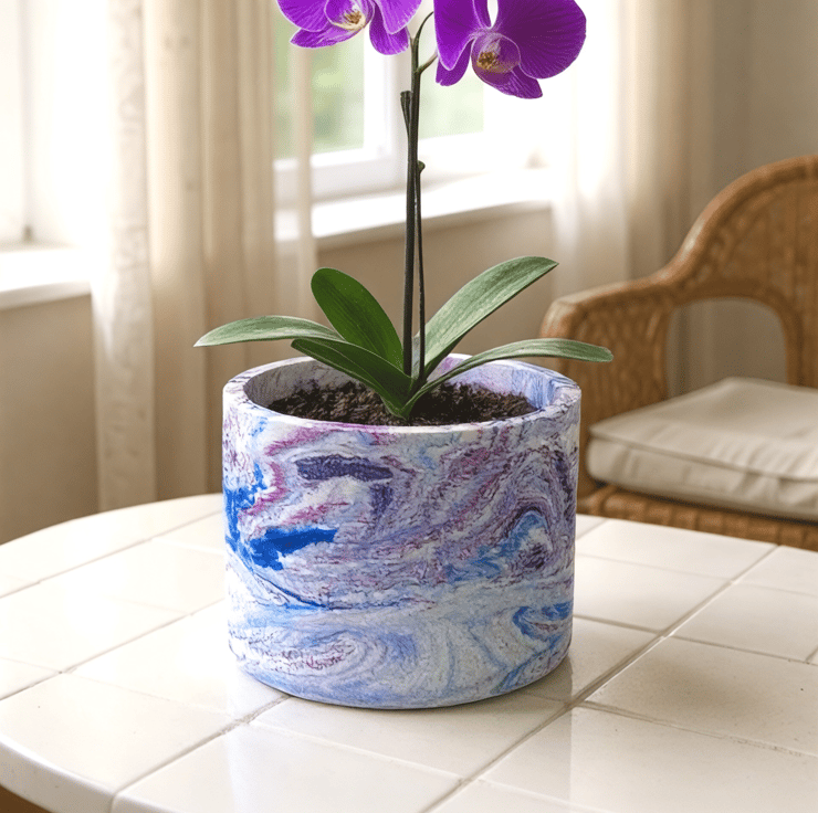 Marbled blue, pink, purple and soft white round plant pot for indoor houseplants, succulents and herbs. This colourful planter has a flowing swirl pattern that makes a bright accent for a windowsill, desk or shelf. It also makes a lovely gift for plant lovers and anyone who enjoys colourful handmade home decor.