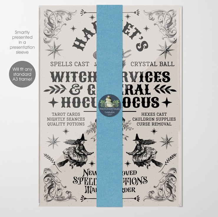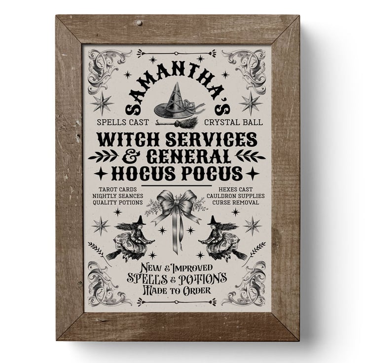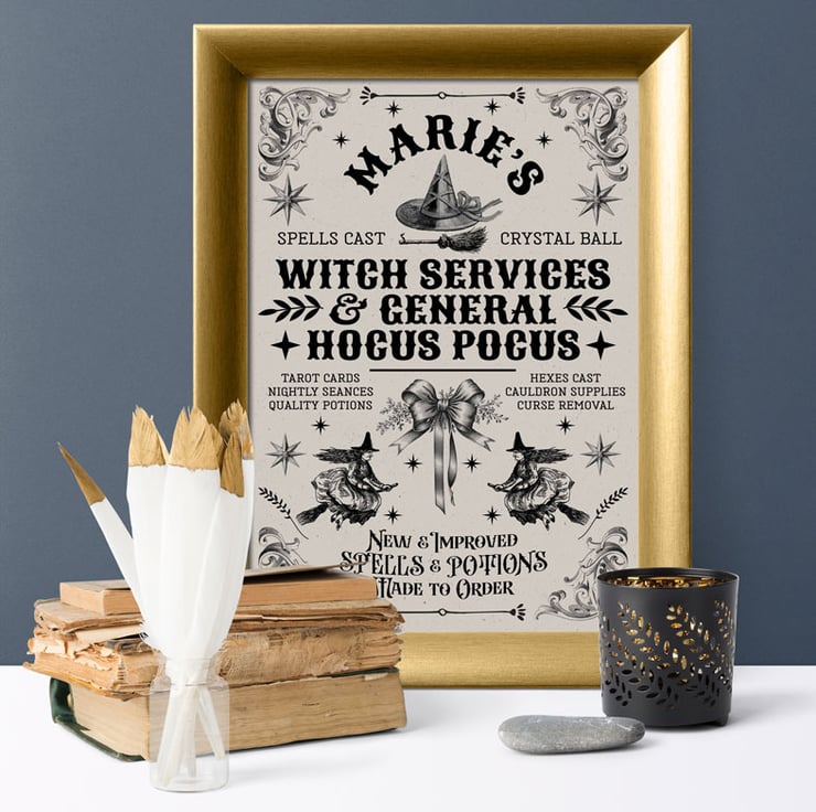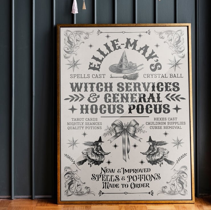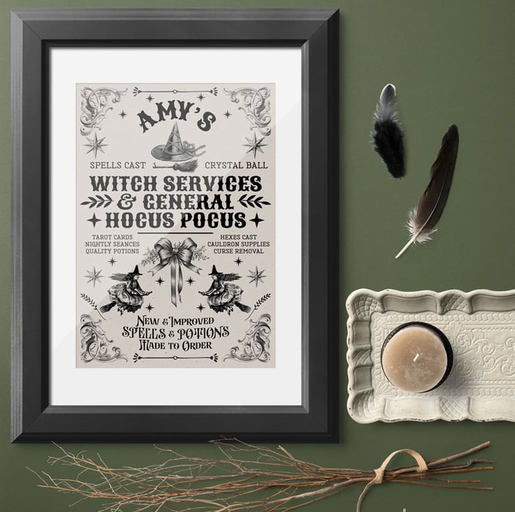 Personalised with your chosen name (up to 10 characters), it is printed in simple black ink using lovely textured off-white recycled paper. Featuring old fashioned font styles along with genuine vintage imagery from old artworks, books and prints. A personal witchy touch for your own room or ideal if you're seeking a one-of-a-kind gift to cast a spell of delight!