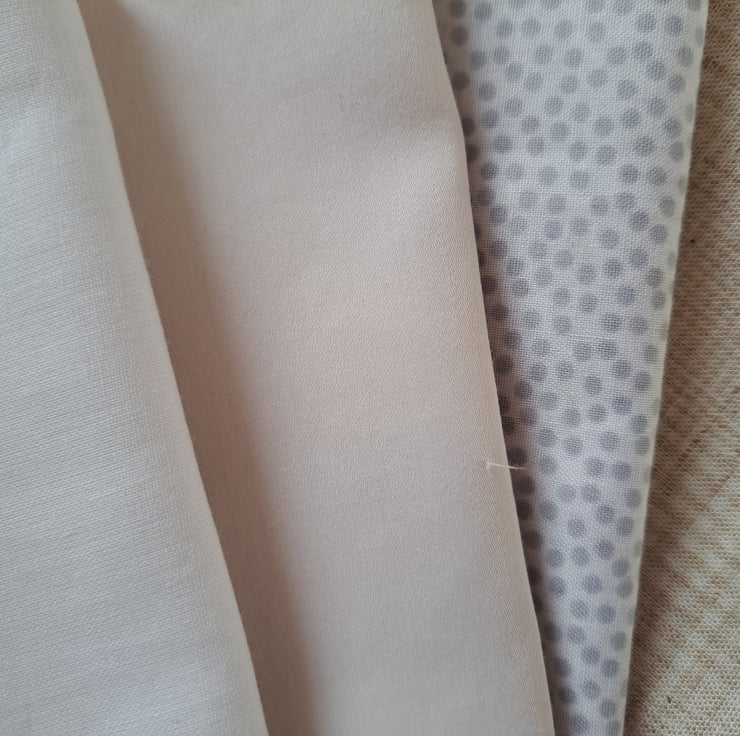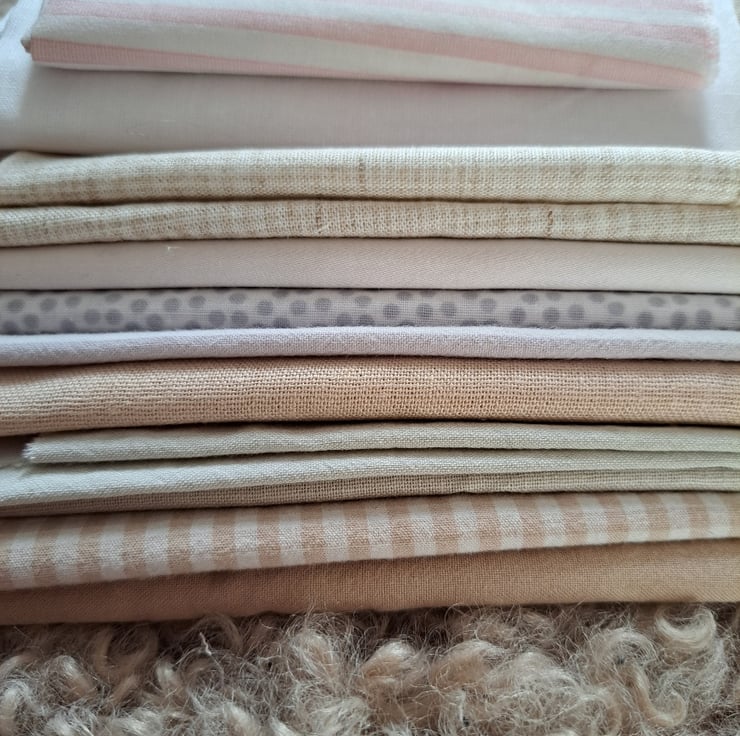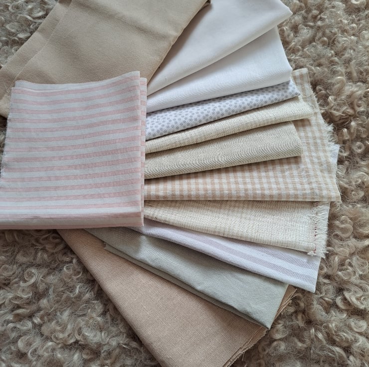We all need plain or neutral colours in our sewing projects.... otherwise how would our favourite fabrics stand out? This nice chunky bundle of 11 pale plains (with a few unassuming stripes and spots thrown in), will dutifully stand back and let the extroverts shine. They look rather beautiful together, to be honest.