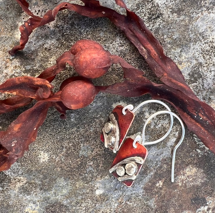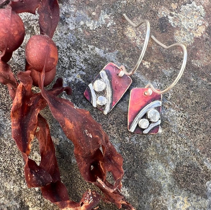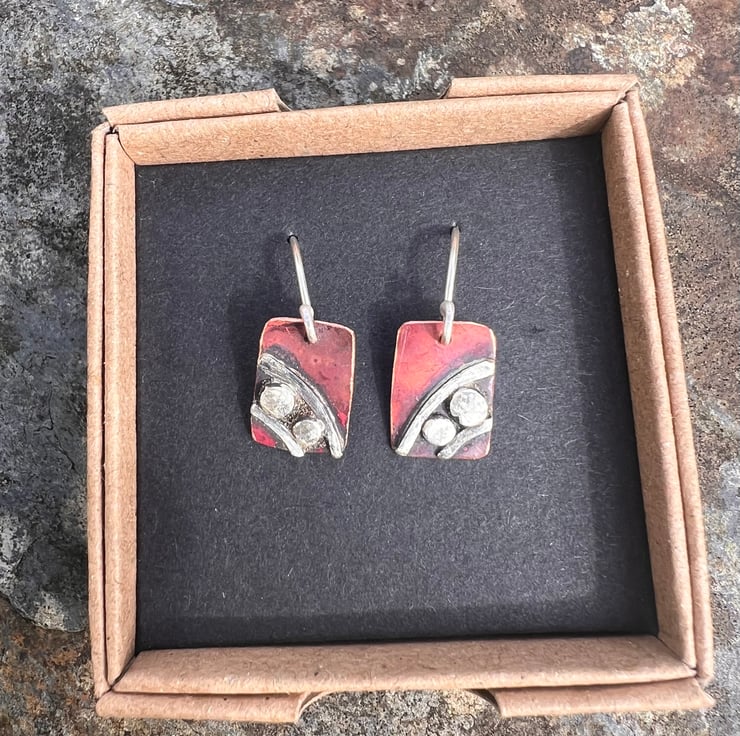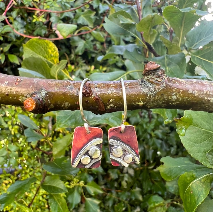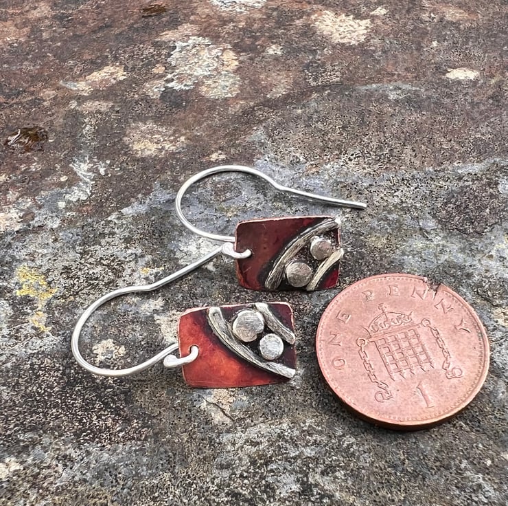 The deep red and dark red tones of the recycled copper have been achieved with heat and are preserved by a penetrating preserving wax.The dangle is 25mm/an inch from the top of the handmade sterling silver earhook.