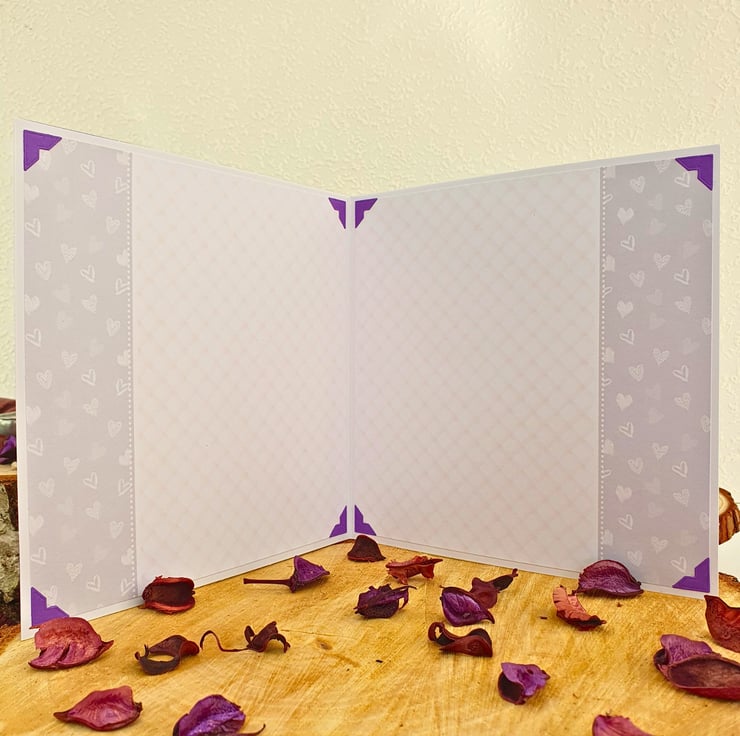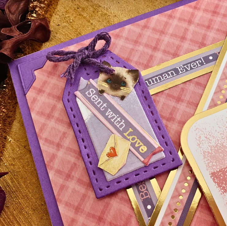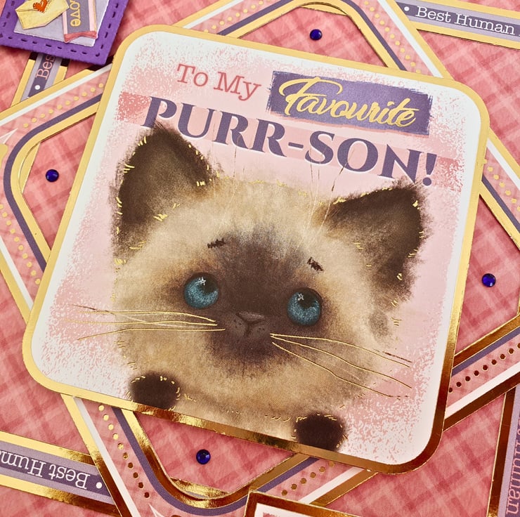 The card consists of mats & layers of purple card & luxury cardstock printed with a pink tartan pattern. The main image of a kitten & the message "To My Favourite Purr-son", is in the middle of the card, surrounded by a matching frames. The sentiment "Just To Say" & a purple tag that reads "Sent With Love" are placed on two of the corners, while the 2 are decorated with purple diamante. The card is finished with a double, coordinating insert, blank for you to add your message & wishes & bordered with decorative photo corners.