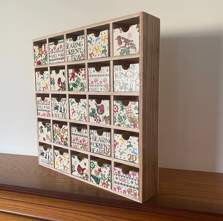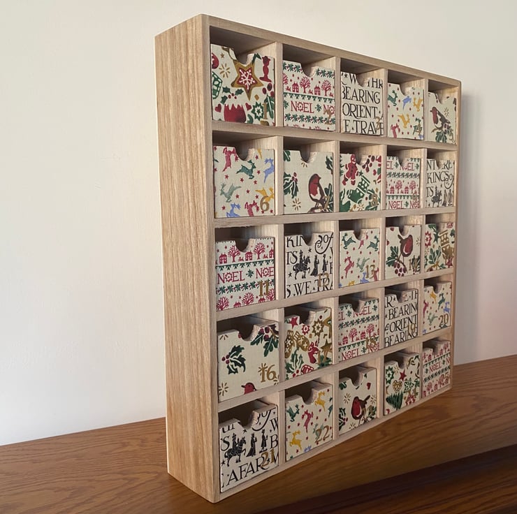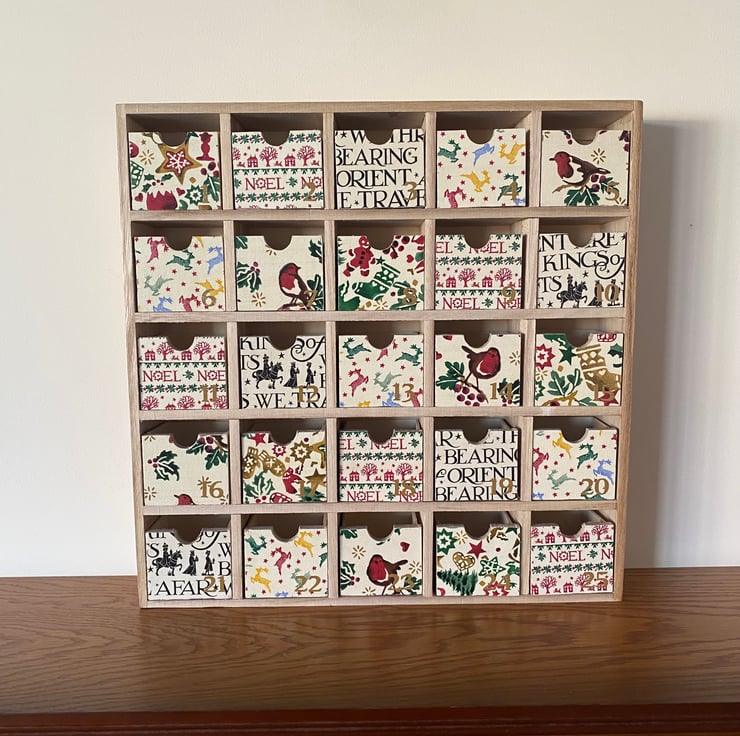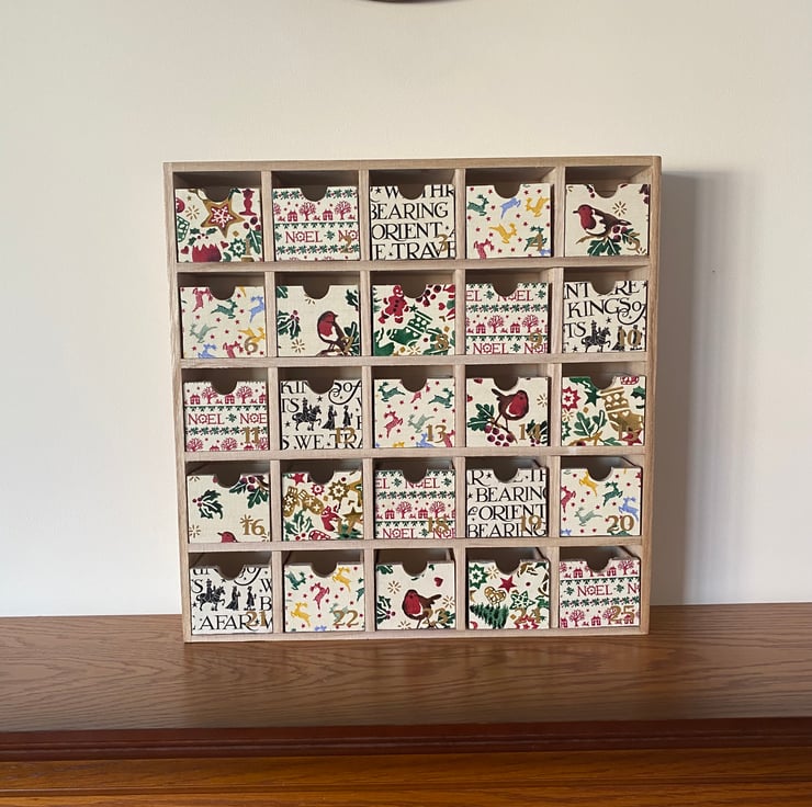 This 25 drawer advent calendar has been decorated with Emma Bridgewater inspired, Christmas themed, paper napkins. The little numbers are made from gold vinyl.