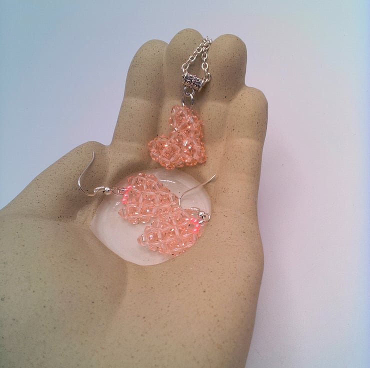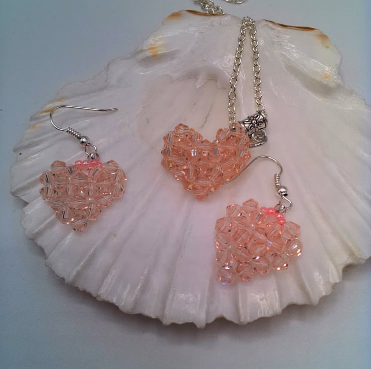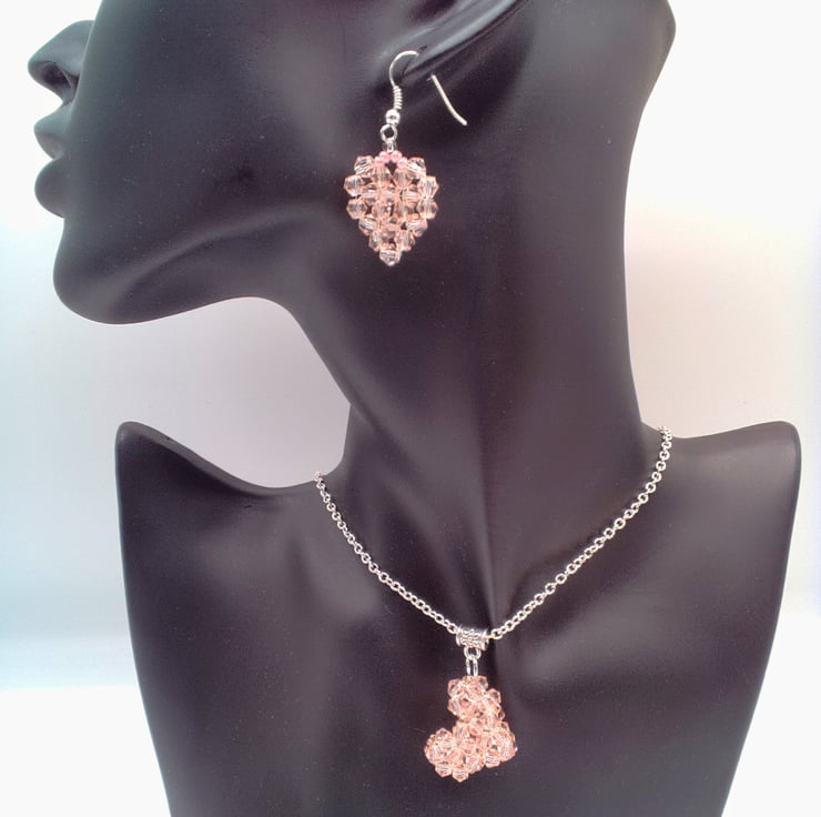 Hand Beaded Crystal Bicone Heart Pendant and Earrings, Custom Make, Gift Set, Necklace, Earrings, Birthday Gift, Anniversary Gift, Gift for Her, crystal heart Pendant, Crystal Heart Earrings