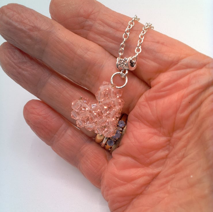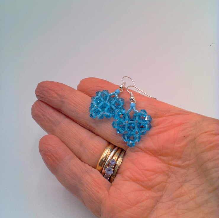 These gorgeous hand beaded crystal heart pendants, on a silver plated chain, and earring sets would go well with any of your outfits that you wear for a special day out or an evening get together. One of them would also make a lovely gift for your friends or relatives for a birthday or anniversary would also make a perfect treat for yourself. The crystal heart is made by hand sewing the thirty eight 4 mm crystal bicone beads and seed beads into the double sided heart shape. The colour of the crystals could represent the birthstone colour for a month. The earrings each use 19 of the 4 mm crystal bicones and are suspended on silver plated ear hooks. The silver plated chain is 18 inches (46 cm) in length and the earrings have a drop of 1 inch (2.5 cm) from the base of the ear hooks. There is either a pale pink or a sky blue set, ready made, to choose from or a set can be made in a colour of your choice. The necklace and earrings will be dispatched wrapped in tissue paper and delivered to you via Royal Mail first class post.