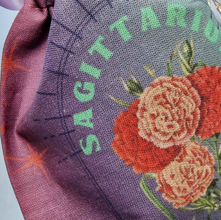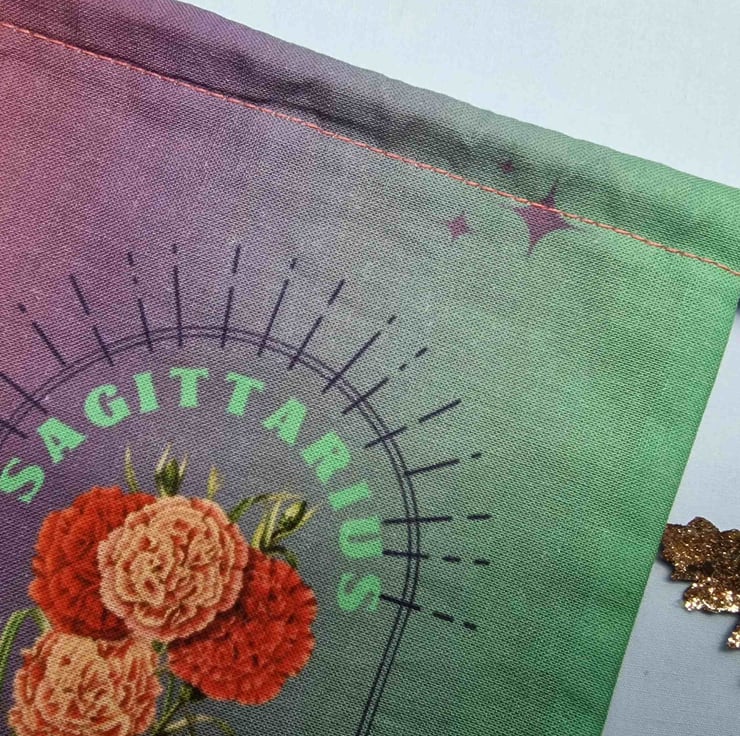 - Adorned with a digital print of the Sagittarius birth flower, this pouch features a captivating gradient that sweeps across the front and back, sprinkled with the radiant Sagittarius constellation for a dash of cosmic wonder.