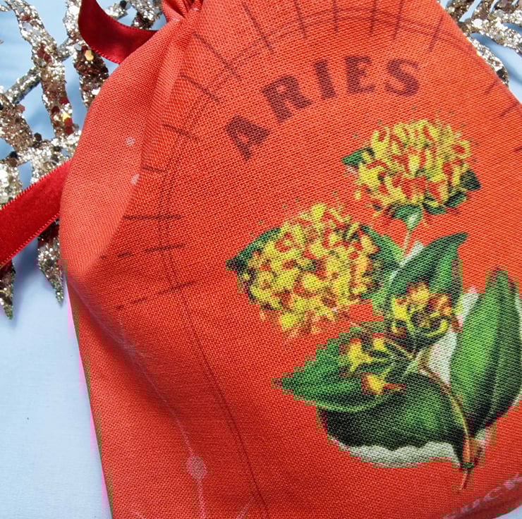 - Elegantly decorated with a digital print of Aries’ fiery birth flower, this pouch dazzles with a bold gradient that dances across the front and back, crowned by the shimmering Aries constellation for a touch of celestial magic.