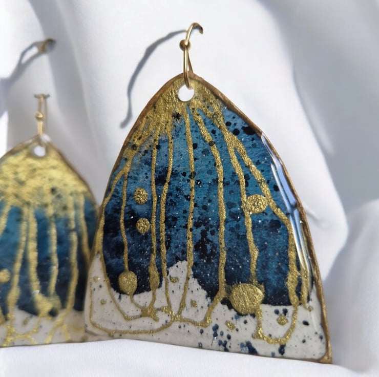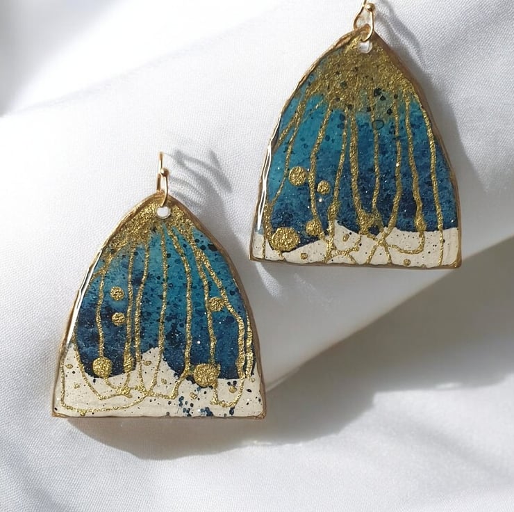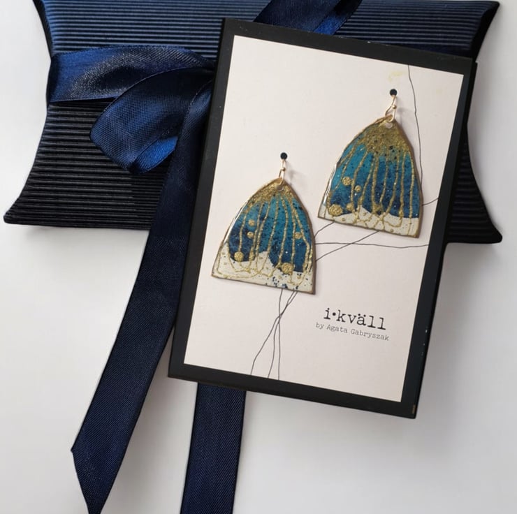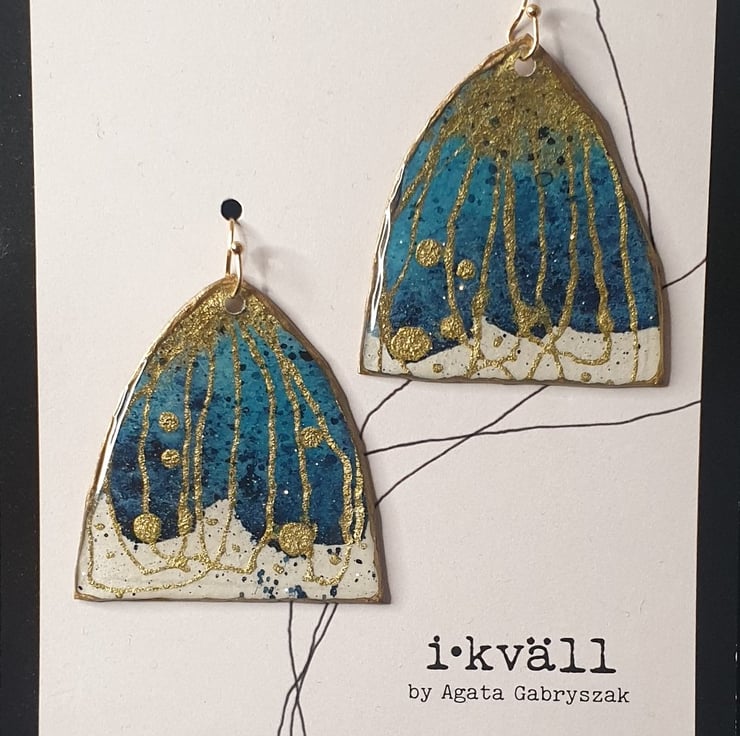 These beautiful large statement earrings are definitely made to impress. Unique mini watercolour paintings with inks, gold pigments and resin which gives them an almost 3D feeling. Extremely lightweight and elegant are ready to match any occasion.