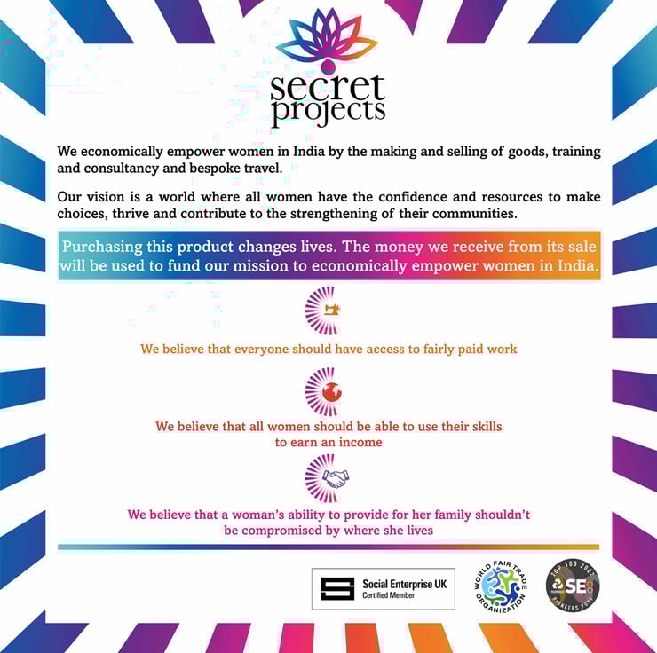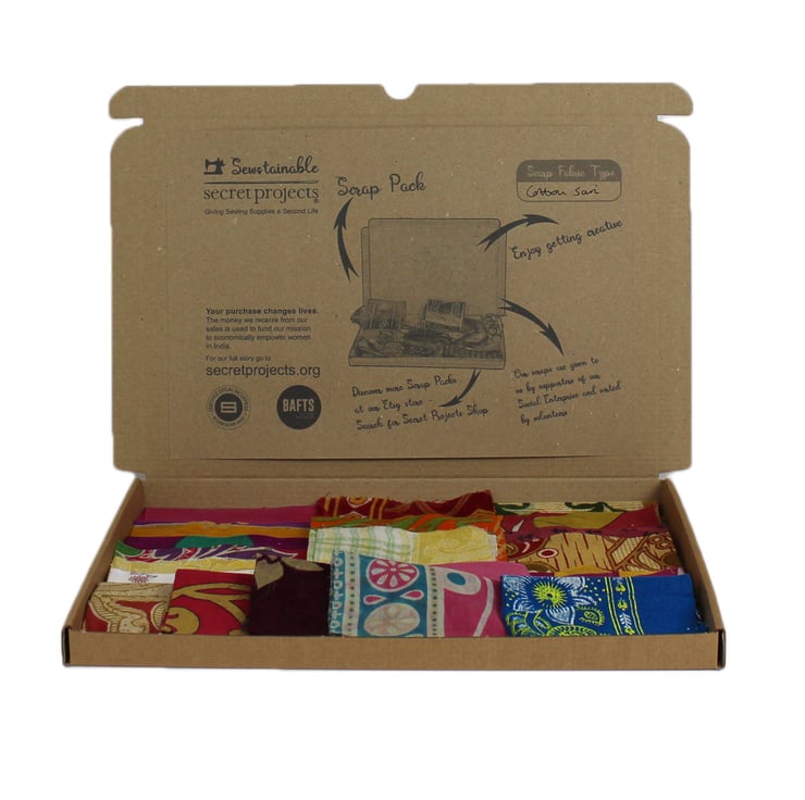 Cotton Sari Scrap Pack is 20 pieces of A4 fabrics. Everyone piece of fabric is from a different cotton sari. The sari fabric was gathered by one of our Makers from East India and they have cut up the fabrics. Our volunteers in West Sussex have packed up the pack after they were shipped by Sea.