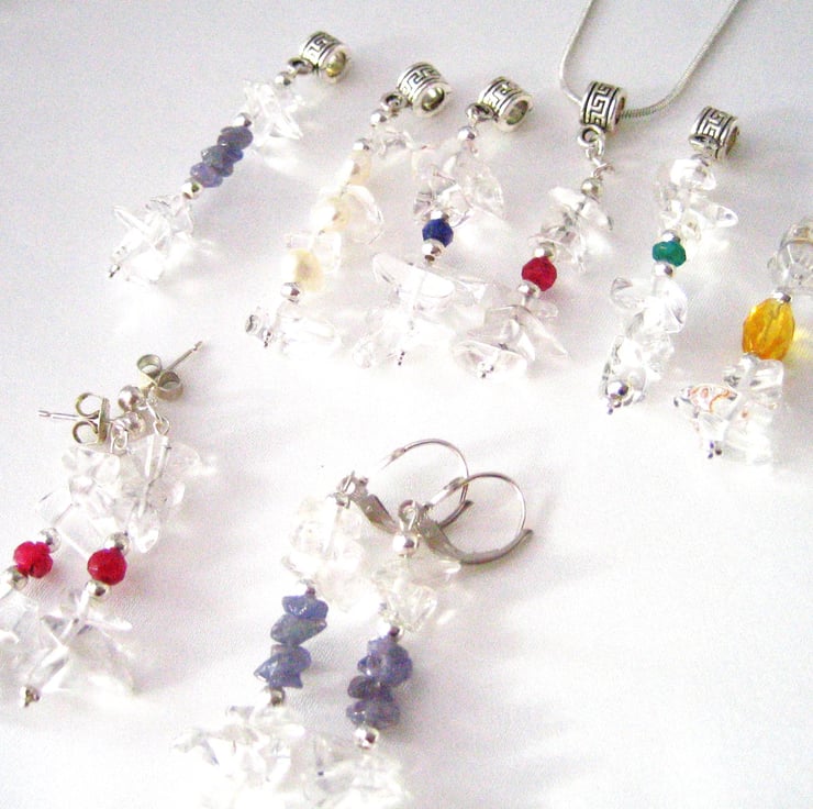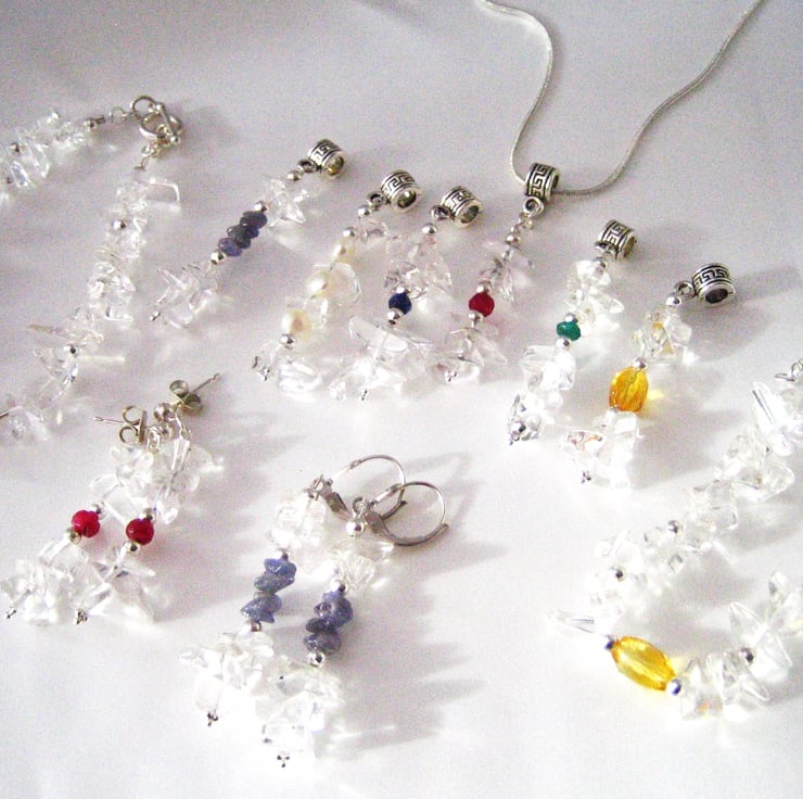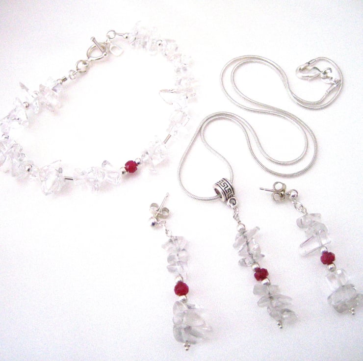 A matching set of pendant, earrings and bracelet with sterling silver 18" chain, with natural crystal Quartz chips.