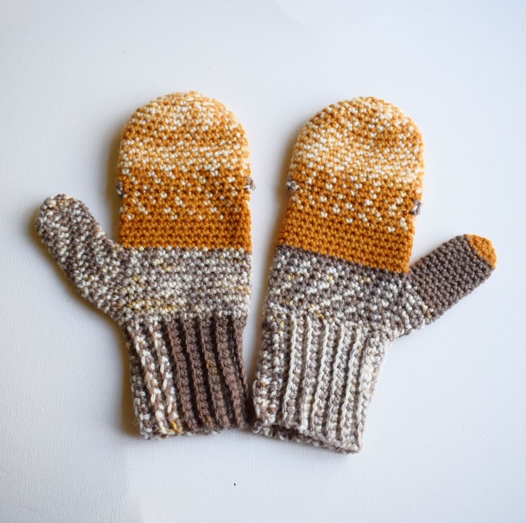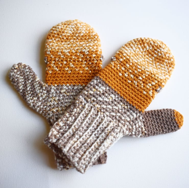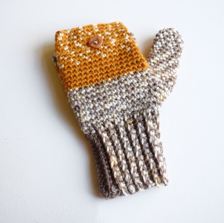 The top mitten section flaps back to make them fingerless and closes again with a little wooden button. Also great if you're going out early but coming back late when it's a lot colder, these will cover both needs!