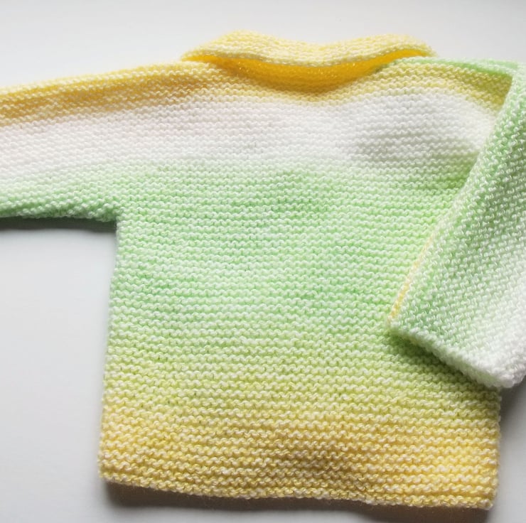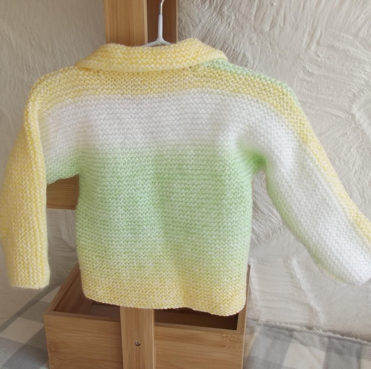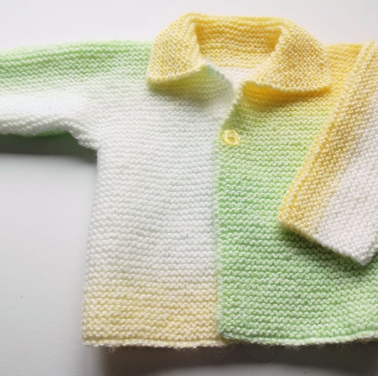 Hand knitted by me. White, lemon and Green Babies Cardigan Jacket. Round neck with collar and 1 button closure. Knitted in medium weight acrylic blend yarn. hm6