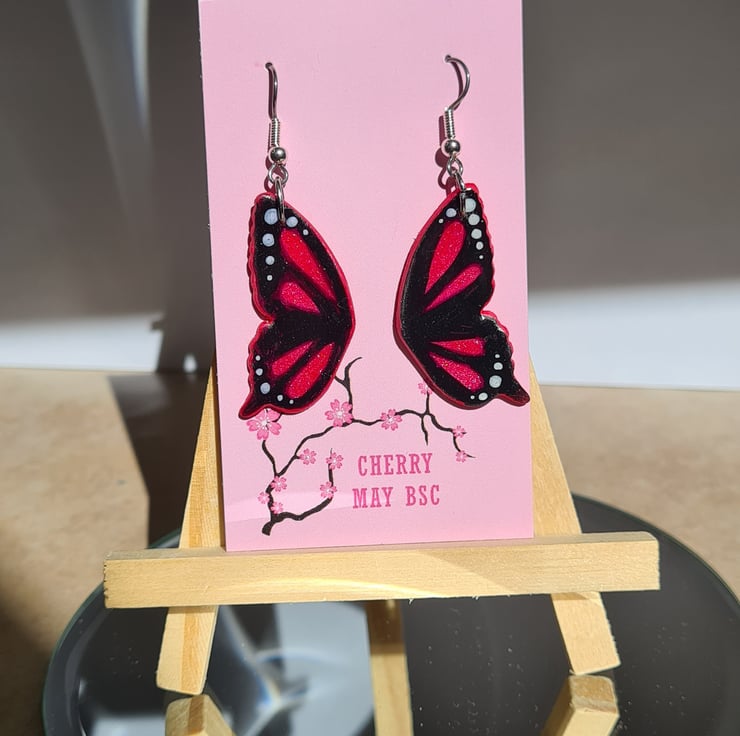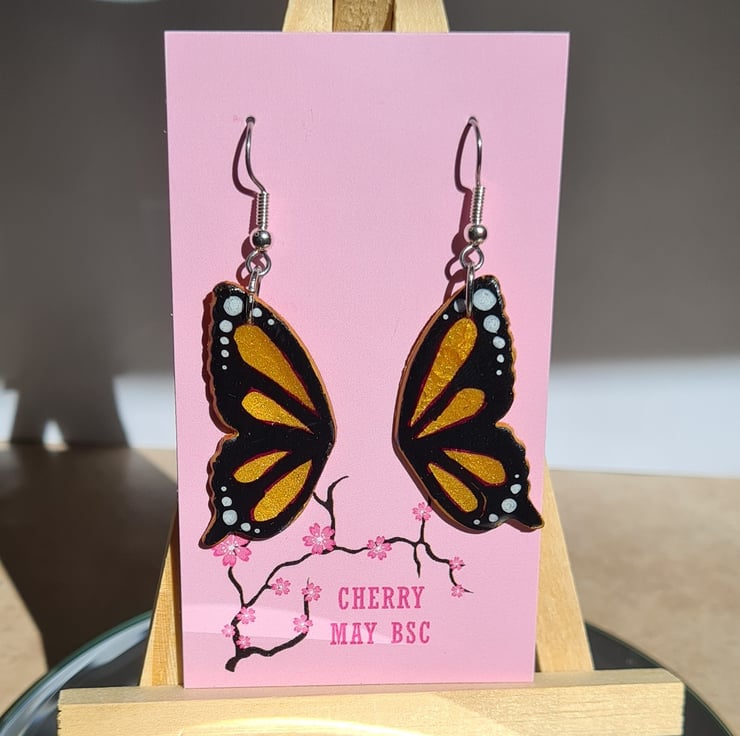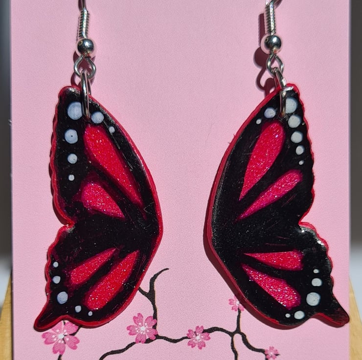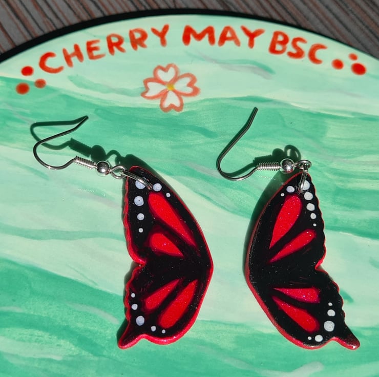 Handmade Butterfly wing shaped earrings, made of shiny metallic polymer clay with paint pen details and then coated in a layer of UV resin to make it shine.