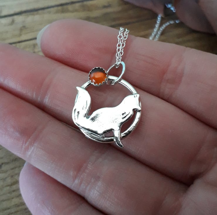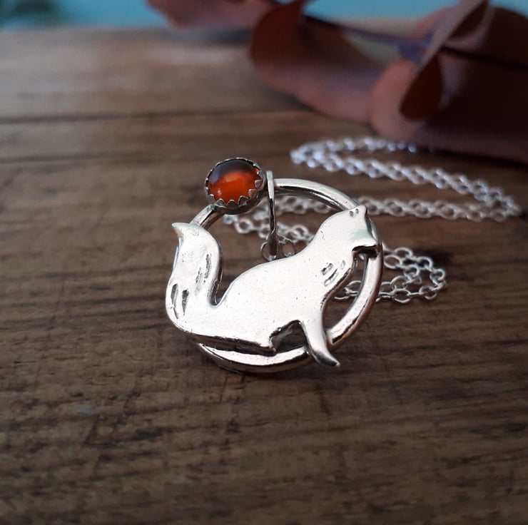 The pendant features a warm glowing hessonite garnet and is made with recycled fine silver and sterling silver. The silver necklace is 18 inches (ca.45cm) long, the pendant is approx 0.6 inch in diameter and the amber is 5mm big.