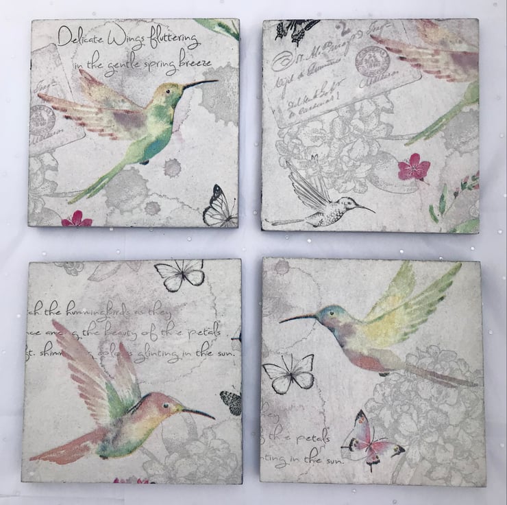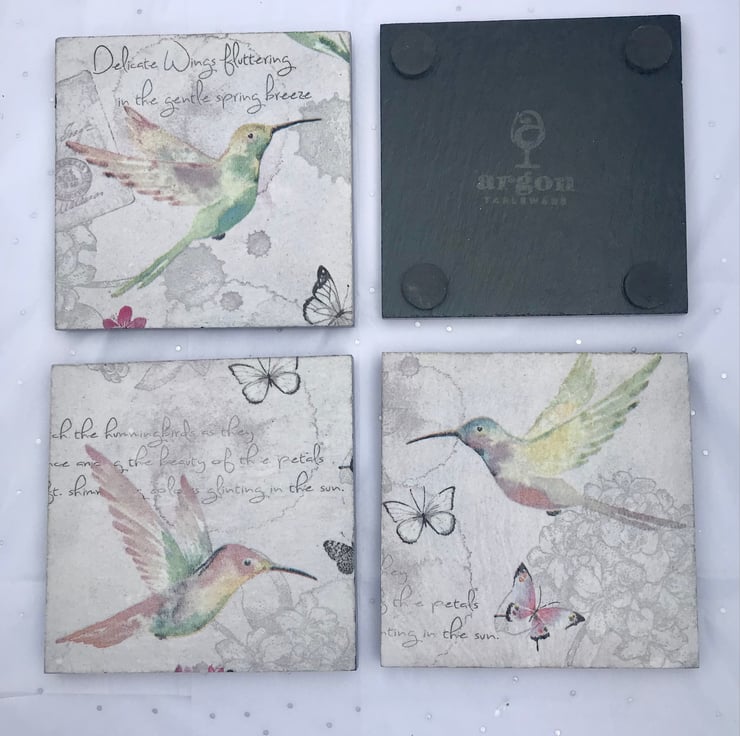 This is a set of 4 slate coasters with a beautiful hummingbird design.