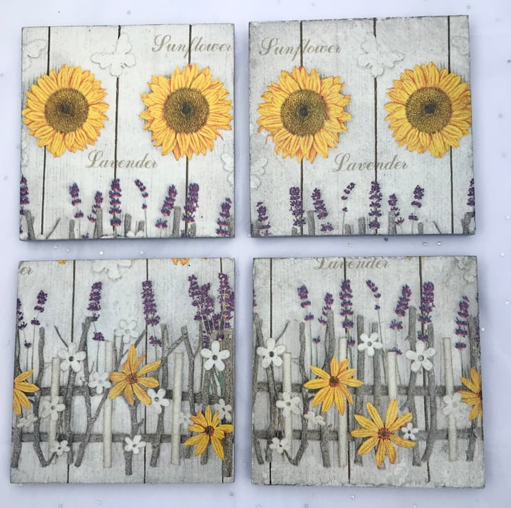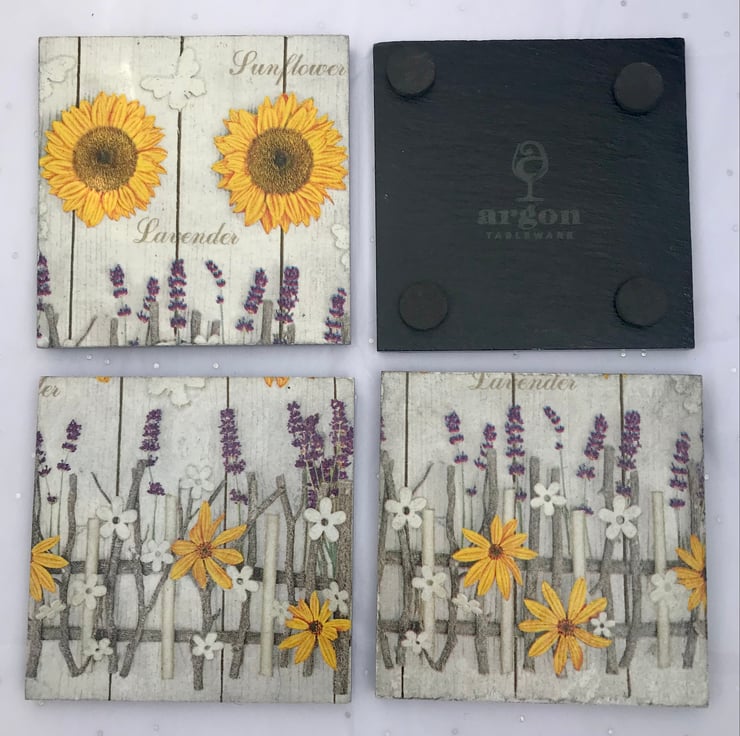 This is a set of 4 slate coasters with a beautiful sunflower and lavender design. Bring in a touch of spring/summer during these winter months.