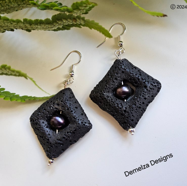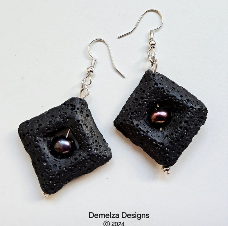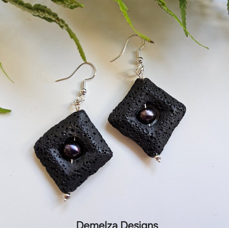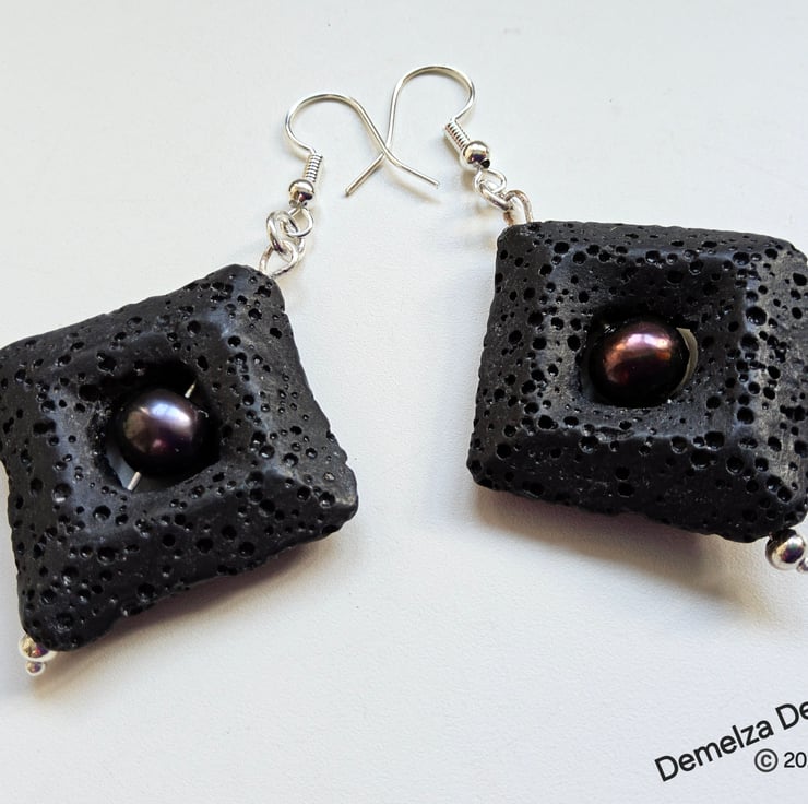 An eye catching pair of earrings designed and hand crafted in Cornwall using large 3.5cms black square cut natural lava stone beads. To compliment them genuine peacock freshwater pearls are in their centres. Lave Stone is light weight.