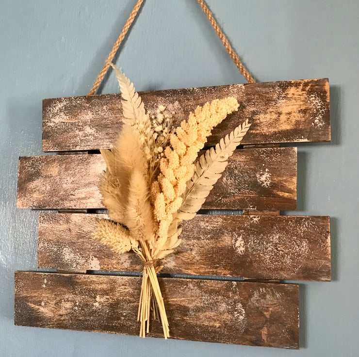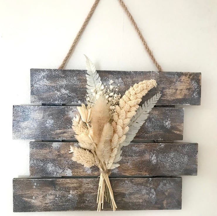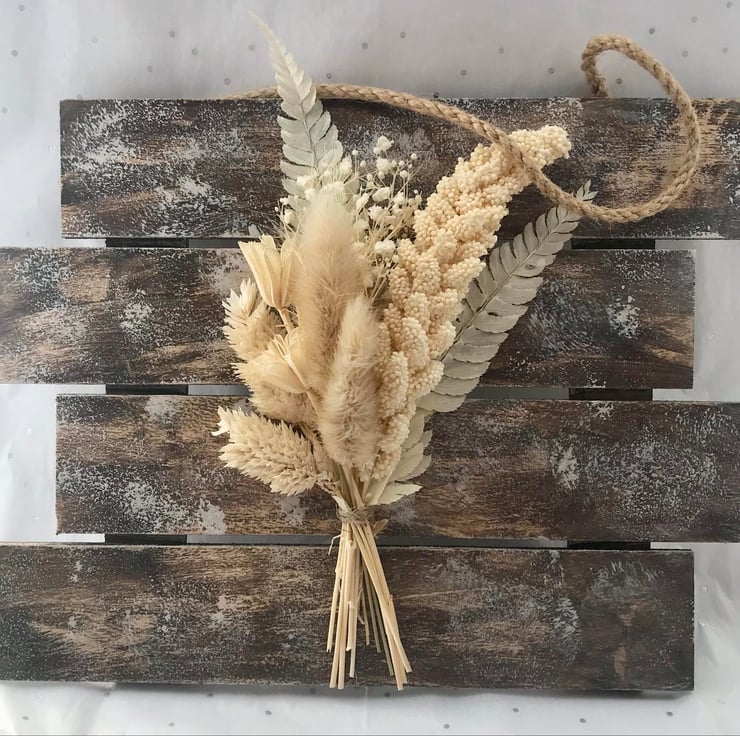 A beautiful wooden hanging board with some stunning creamy looking foliage.