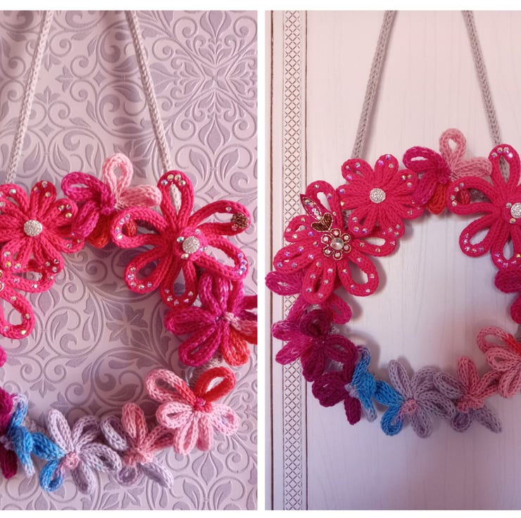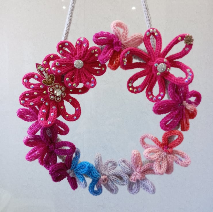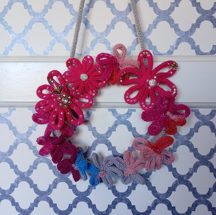 The base is a 20cm bamboo hoop that has been wrapped with soft grey i-cord to pad it. Each flower has been hand sewn in place.