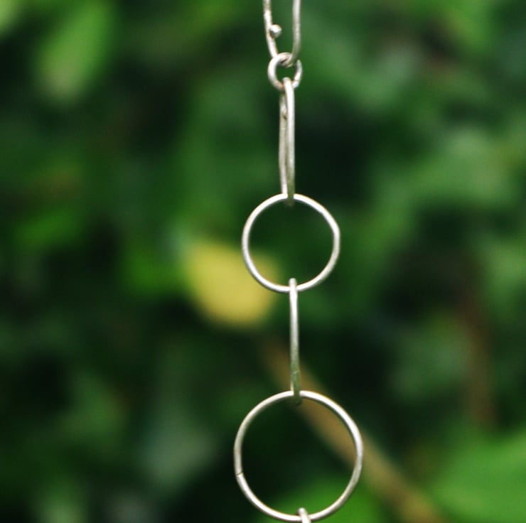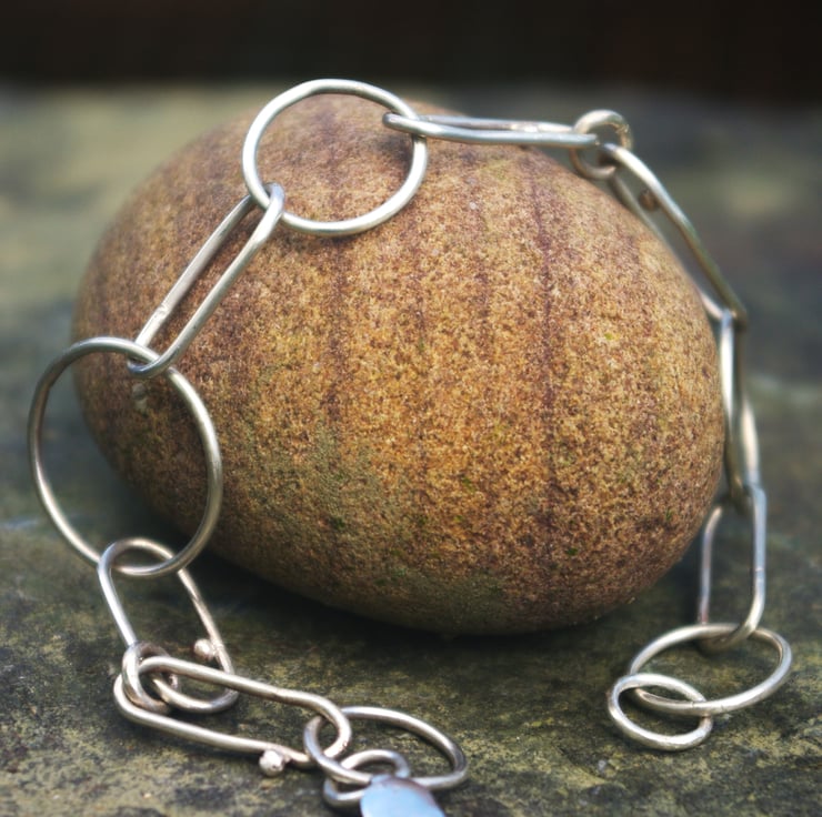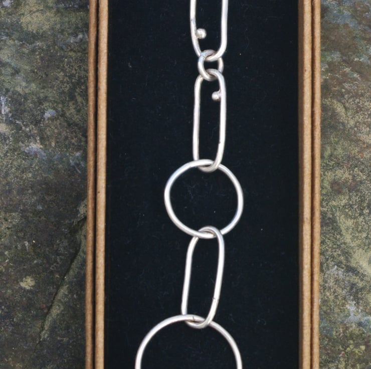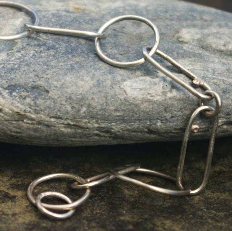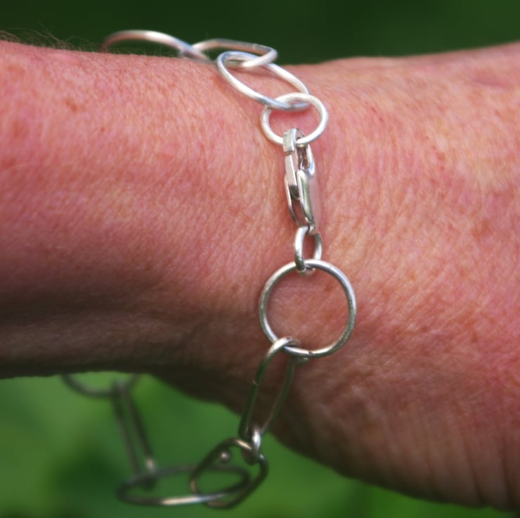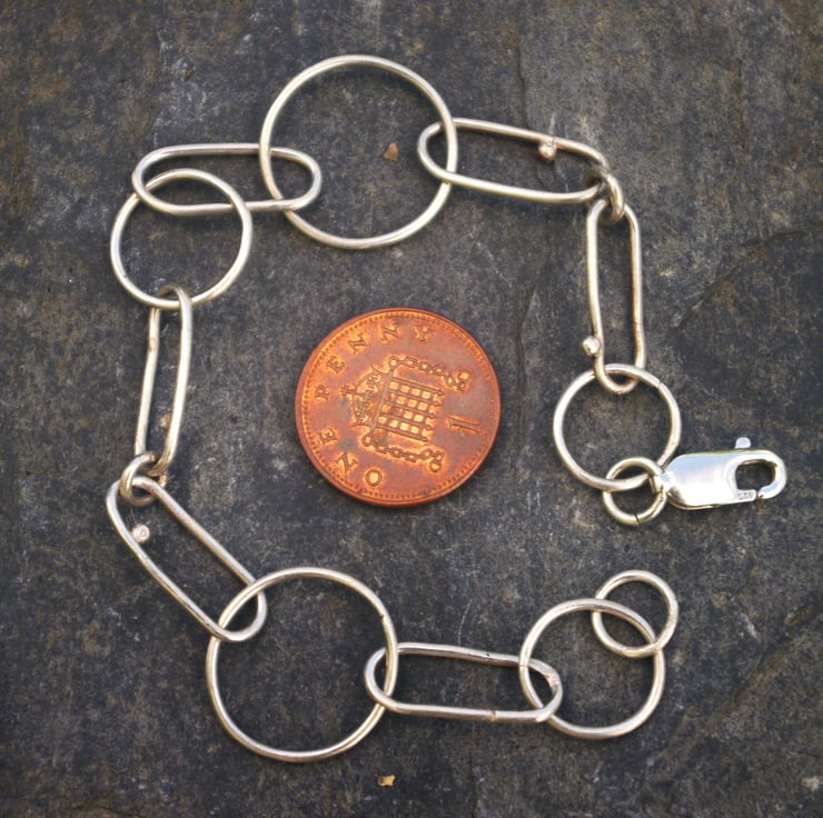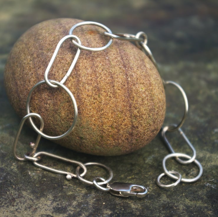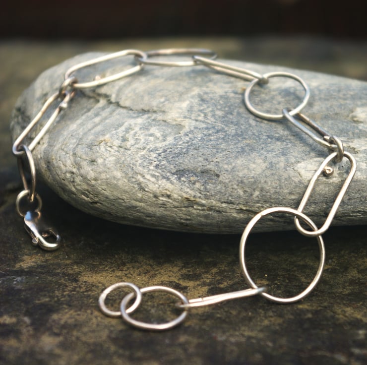 A silver chain link bracelet The links are elongated and made with eco sterling silver wire; joined with small circular links including 5 larger circles of different sizes. All links are soldered closed and the fastening is a lobster clasp. The bracelet has a rustic quality with some small pebbles of silver on a few of the elongated links.