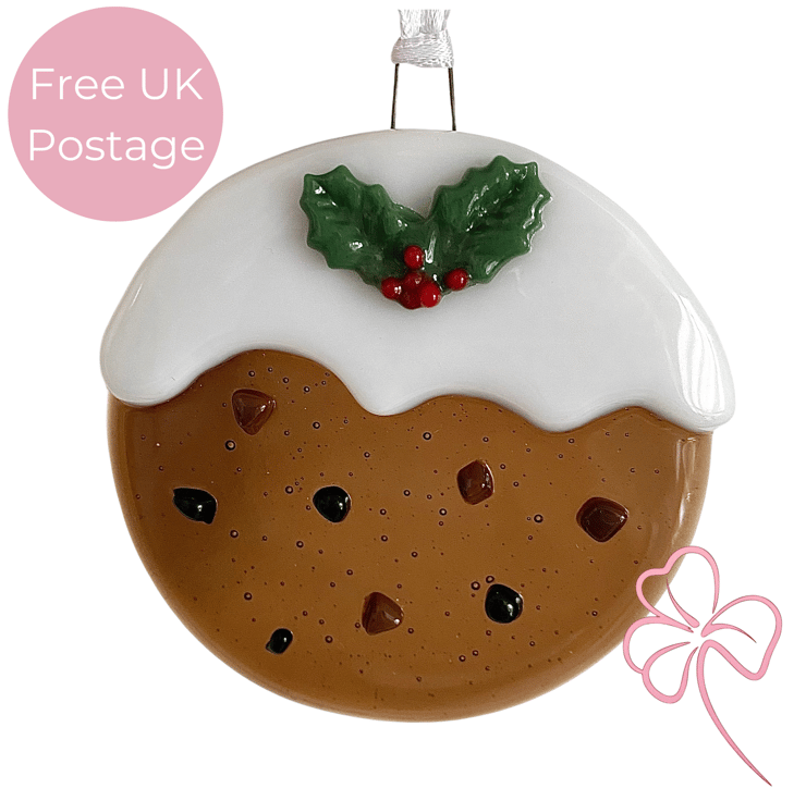 This fun Christmas pudding decoration has been made with hand cut transparent brown glass fused twice in a specialist kiln. First the brown pudding was fused at 800 degrees Celsius. Then the icing and holly leaves were added on a tac fuse at 740 degrees Celsius to keep the definition of shape. The holly leaves were made separately using the freeze and fuse technique with glass powders. it measures approximately 78mm across and is hung on white ribbon.