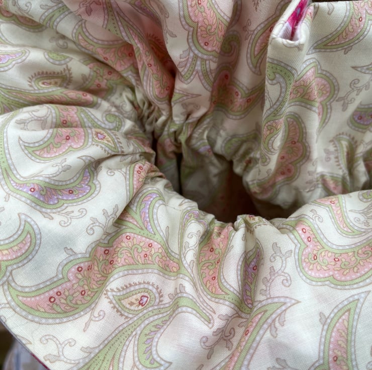 Pretty drawstring bag in a vintage style rose print cotton. Fully lined with pastel paisley cotton and finished with velvety cream pompoms.