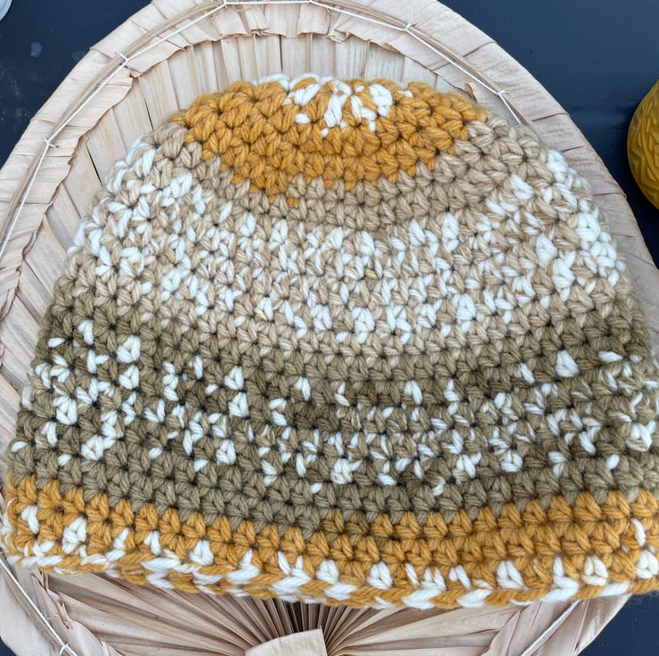 Stay cozy and chic with this must-have mustard and natural earth tones fair isle inspired crochet beanie hat! Embrace the warmth and style of the season with this beautifully crafted accessory. The combination of rich mustard and earthy tones in a fair isle design adds a touch of classic charm to your winter look. Whether you're out for a stroll or hitting the slopes, this beanie hat is the perfect blend of fashion and functionality. Elevate your winter wardrobe with this stylish fair isle crochet beanie today!