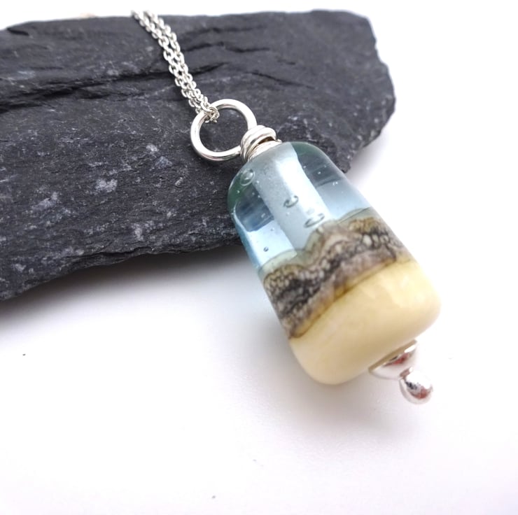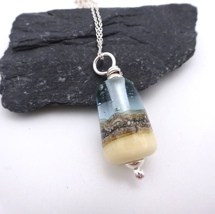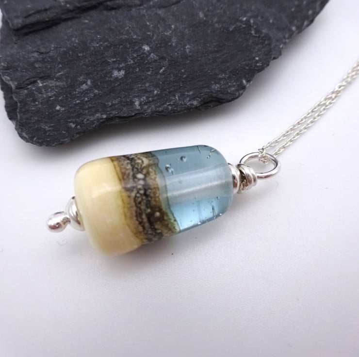 It features a sterling silver chain strung with a handmade lampwork glass pendant made with transparent aqua and ivory glass.