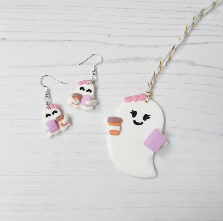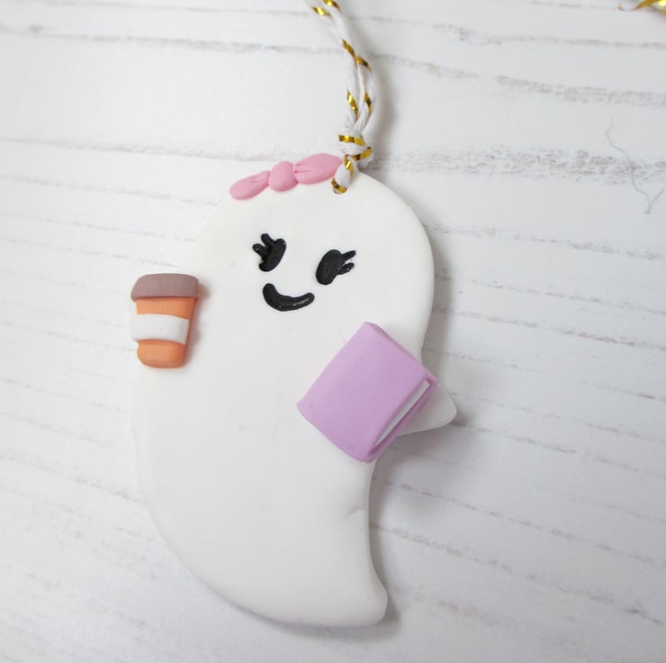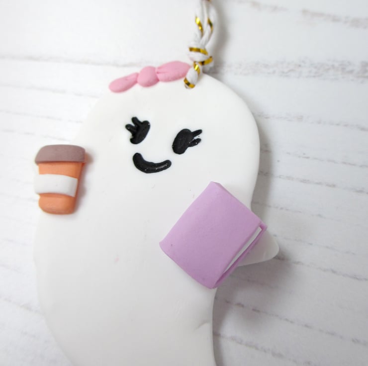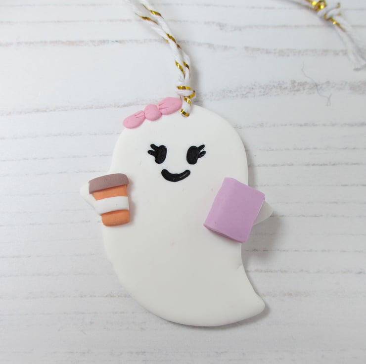 She's the boss! A very cute ghost themed decoration, made from white polymer clay, with a gorgeous pink bow, holding a tiny coffee cup and diary planner, ready to take on the world! Just perfect for a friend or relative to add to their home decor.