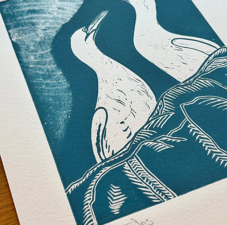 A linocut print of two gannets together against a rocky background captures the grace and intensity of these majestic seabirds in their rugged coastal habitat.