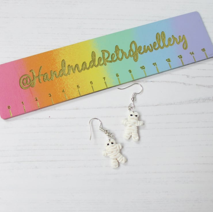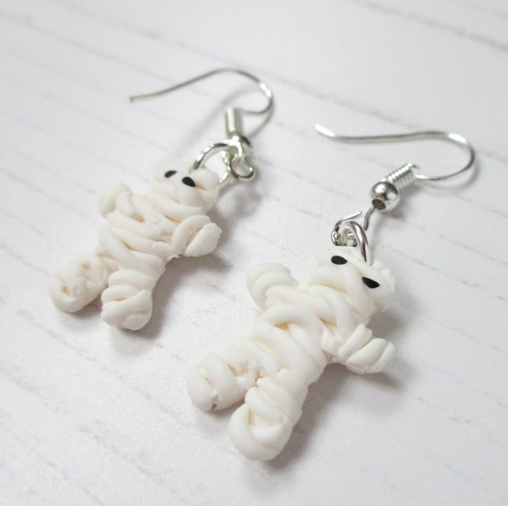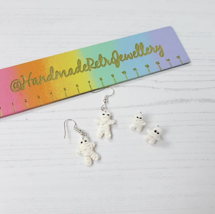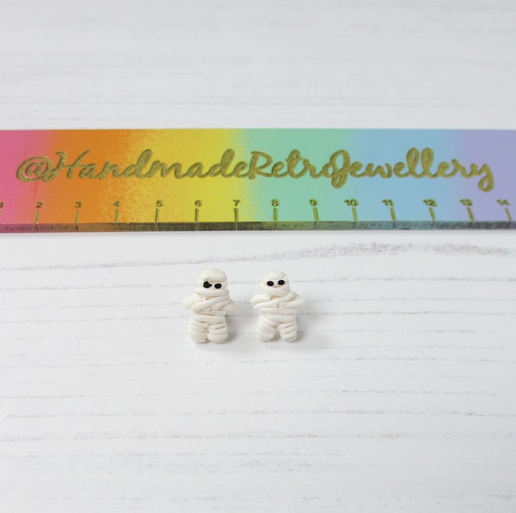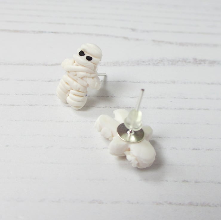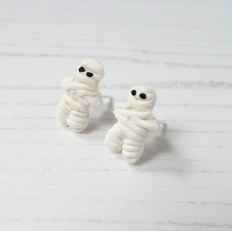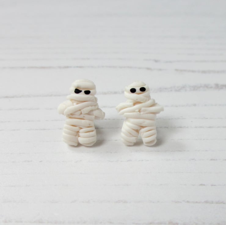 These mini earrings have been carefully hand crafted using white polymer clay, with wrapping to look like tiny cute mummies!!