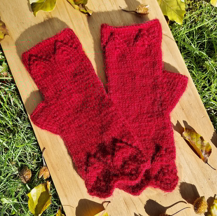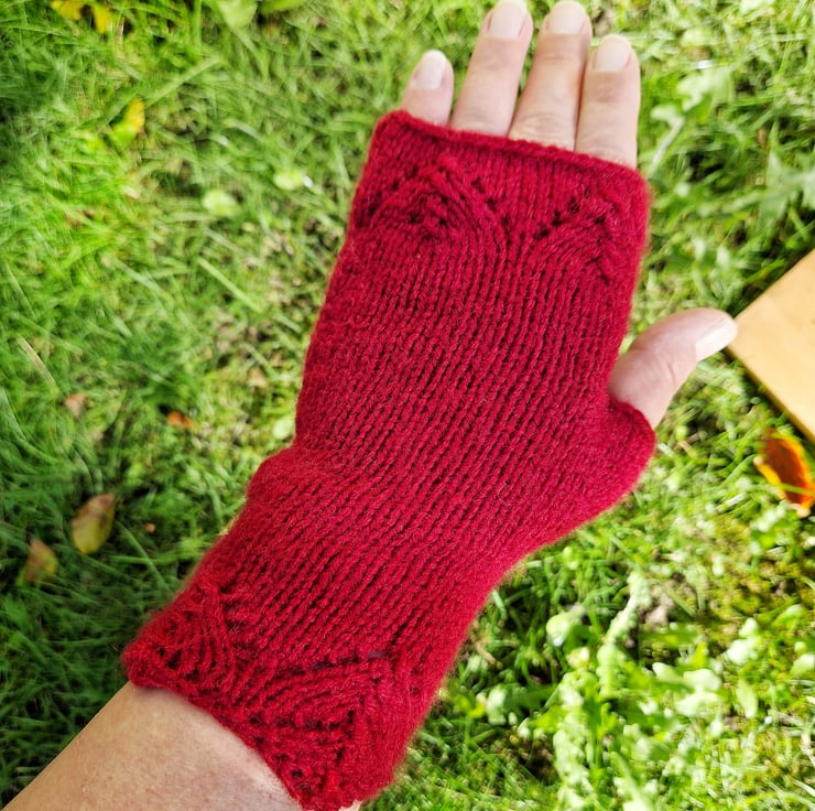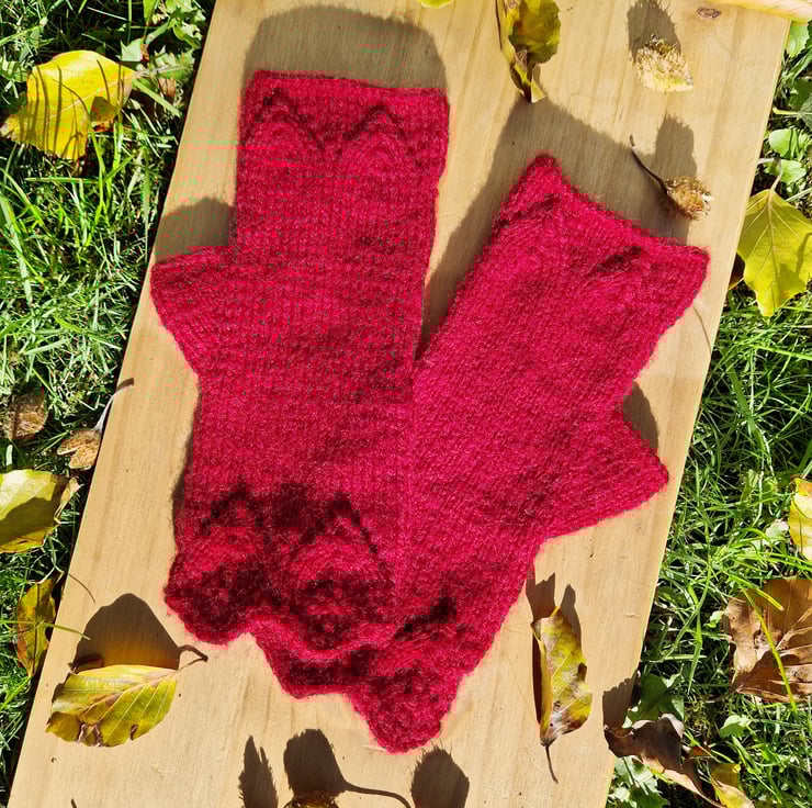 Experience a level of softness you've only dreamed of with our elegant, hand knitted lace fingerless gloves. A cosy blend of acrylic and pure wool, these pretty knitted wrist warmers feel like cashmere against the skin, yet afford a greater deal of warmth owing to the aran weight of the yarn. They feature a thumb hole and extra length at the wrists to minimise draughts, as well as a continuation of the pretty, gothic lace decorating the finger area.