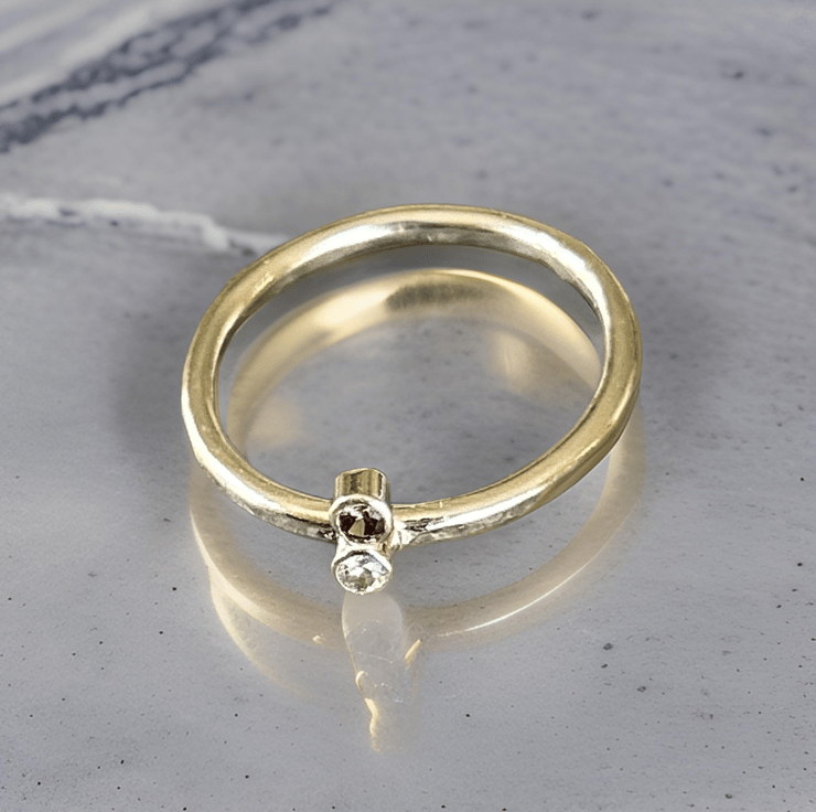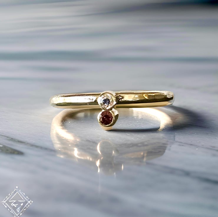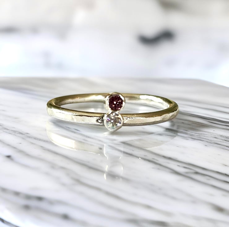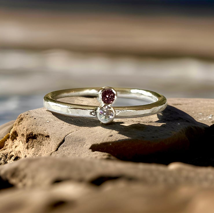 This stunning sterling silver ring features a contemporary minimalist design with a soft hammered finish. Showcasing two 2.5mm cubic zirconia stones. This ring features an Amethyst and a Diamond Cubic Zirconia offering a subtle sparkle. Made with eco friendly recycled sterling silver.The band is 2mm wide. Personalise your ring by selecting your preferred stone colours from options like amethyst, topaz blue, citrine yellow, peridot green, dark green, ruby red, champagne, or baby pink. Just add your choices in the notes when ordering or send a message for customization. Each ring is handcrafted in Woolacombe, north Devon, making it a truly unique piece of artisan jewellery.