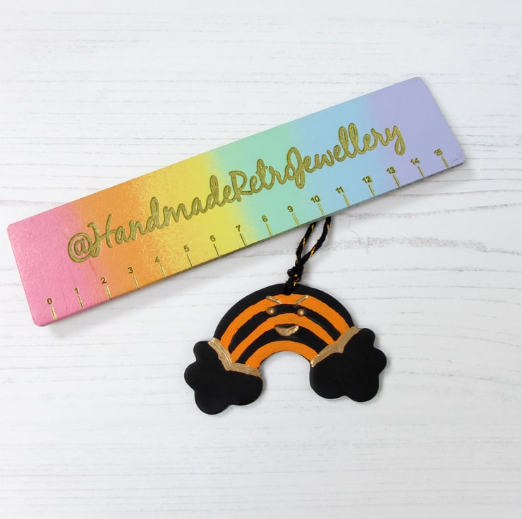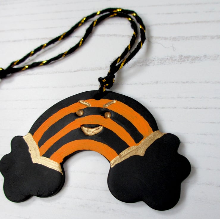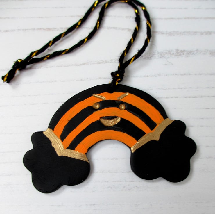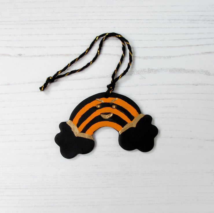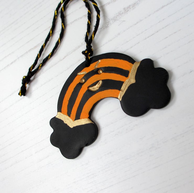 A black rainbow shaped piece, made of polymer clay, featuring orange stripes, gold detail and a scary (but still cute) face!