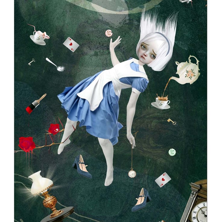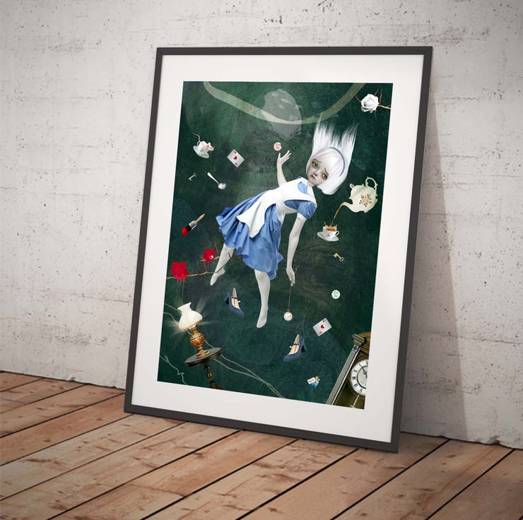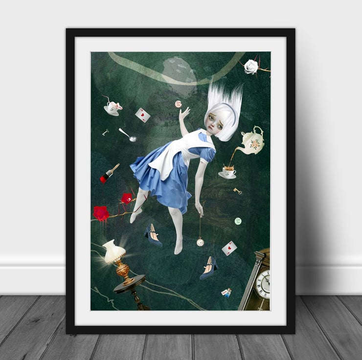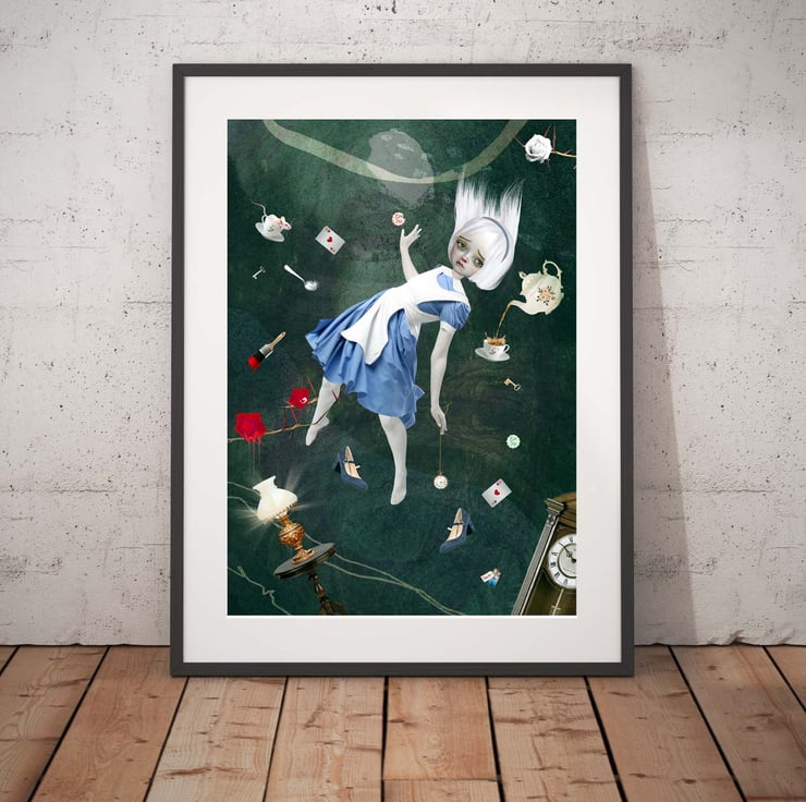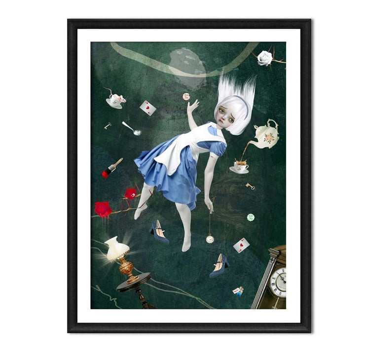 In this fairytale art print, Alice tumbles headfirst down the rabbit hole, her world a whirlwind of whimsical colors and shapes. The scene captures the thrill and curiosity of her unexpected journey into the fantastical realm of Wonderland.