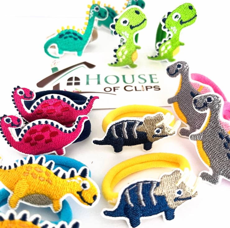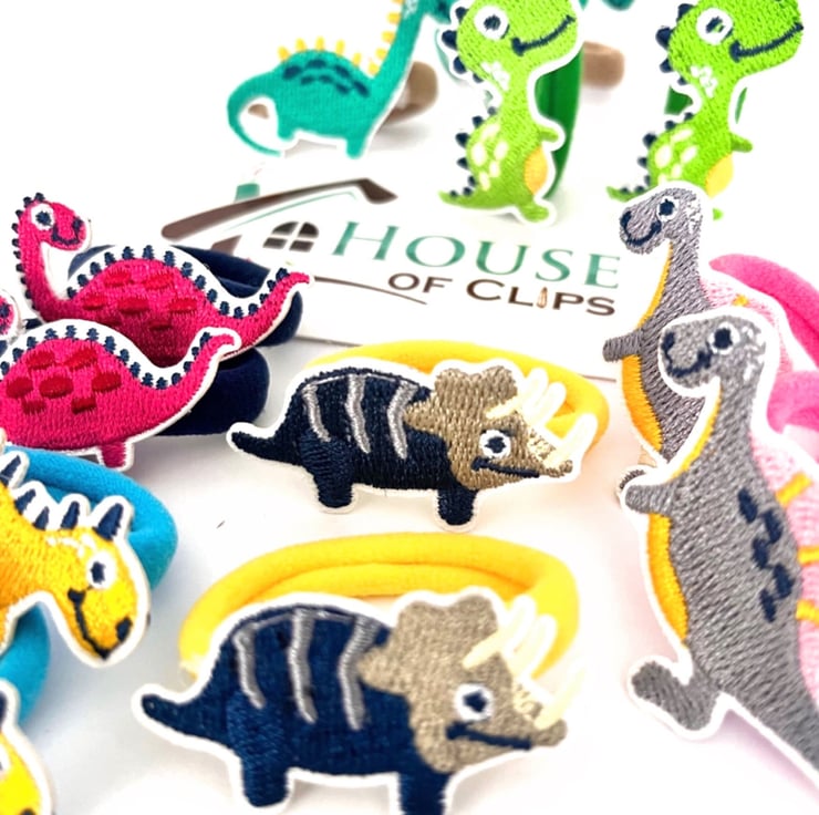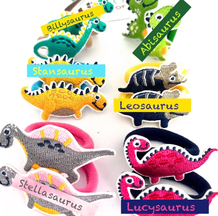 The hair bobbles are embroidered dinosaurs set upon elasticated bands. Colours chosen to compliment the dinosaur colours.