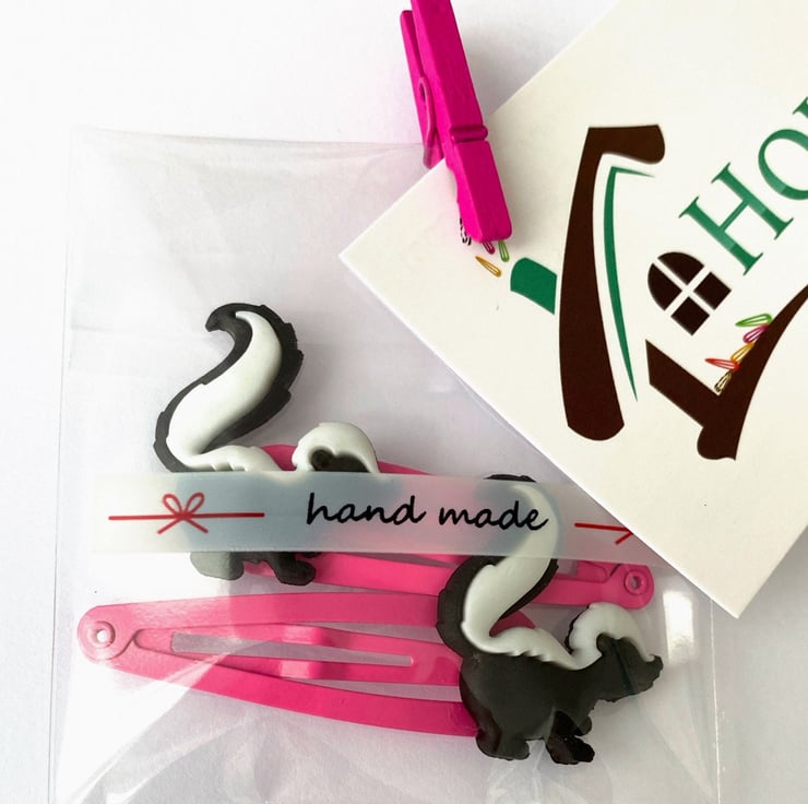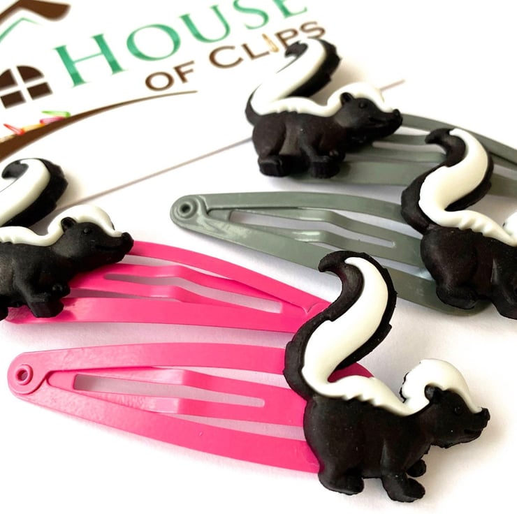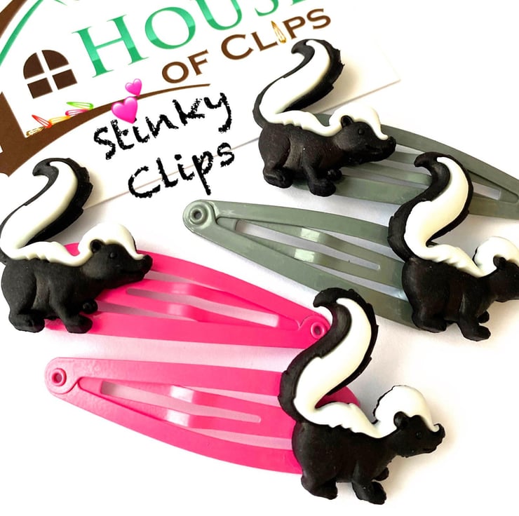 Stinky Hair Clips, beautifully made with lots of detail to the little skunk. Perfect gift; a touch of humour whilst still being cute!