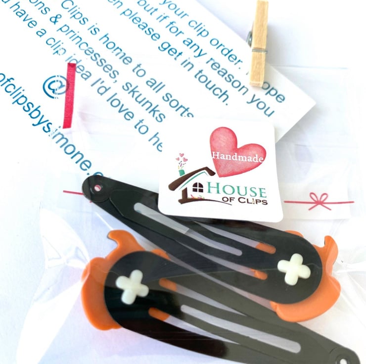 Theses fun Halloween hair clips arrive in a Halloween printed bag with a house of Clips card attached with a tiny peg. All clips are placed in a bright metallic envelope making it the best Halloween present