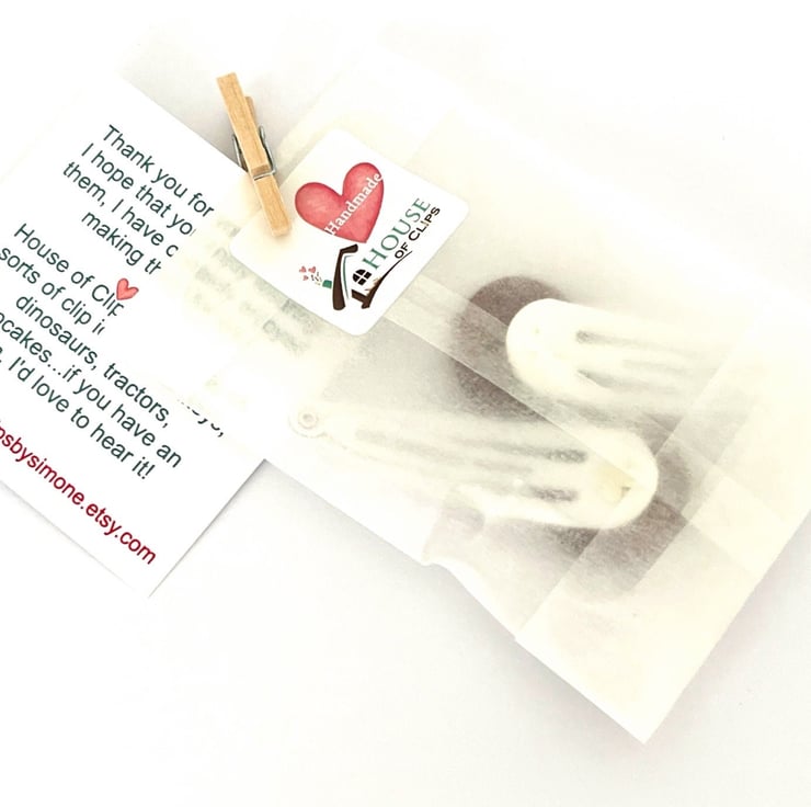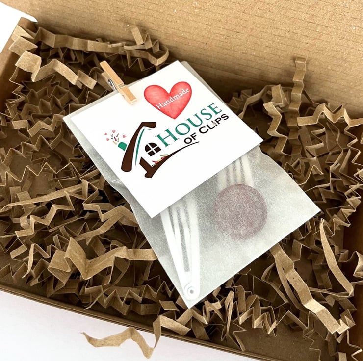 All of my clips arrive in a eco-friendly glassine bag, decorated with a peg and business card, sealed with a House of Clips sticker. The hair clips are placed into a Kraft letterbox nestled in lavender scented shredded paper (please message me if you do not want the lavender scent). Receipts included unless a gift receipt is required.