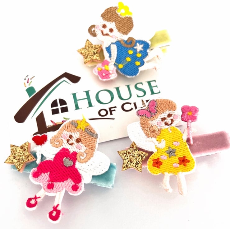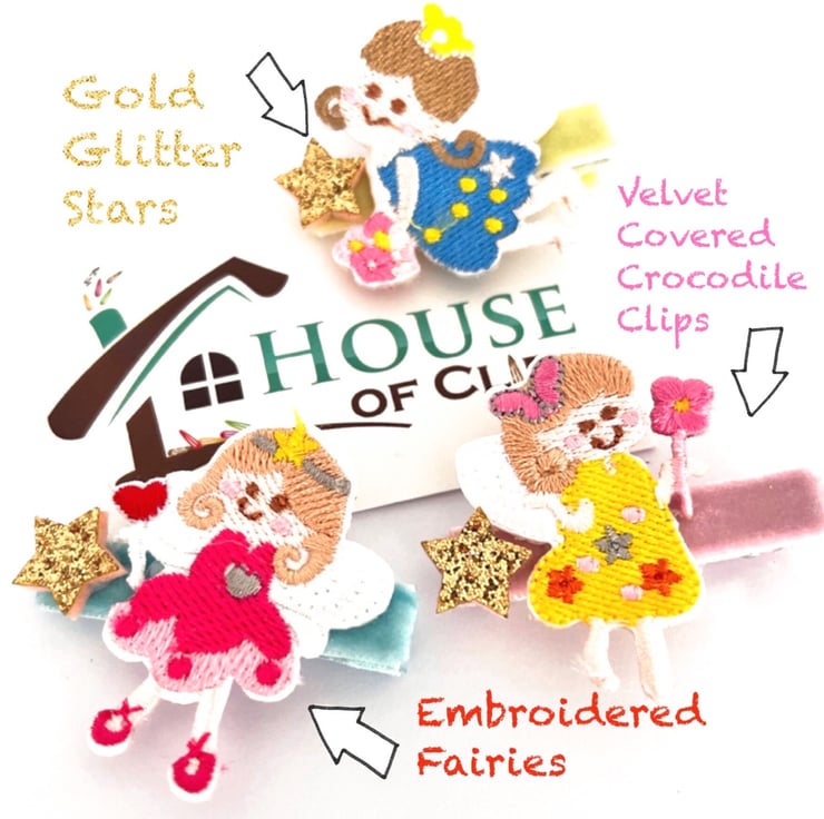 These beautiful fairy hair clips make the perfect gift. The crocodile clips have been covered in velvet; a colour to compliment the sweet little embroidered fairy attached. Each fairy is different but all hold the same gold glitter star, adding texture and a little fairy magic.