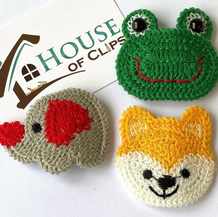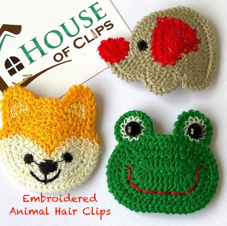 Embroidered Animal Hair Clips with a non-slip snap clip attachment.
