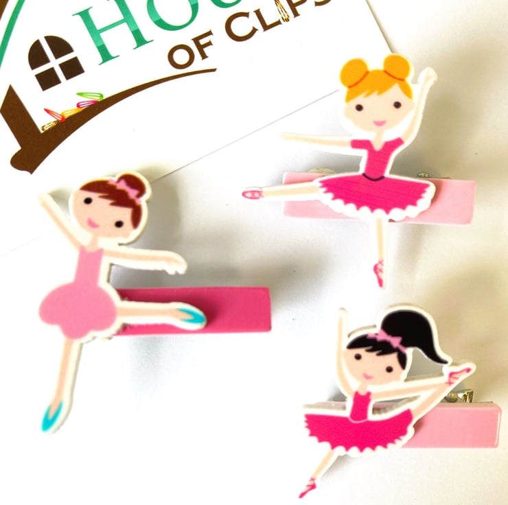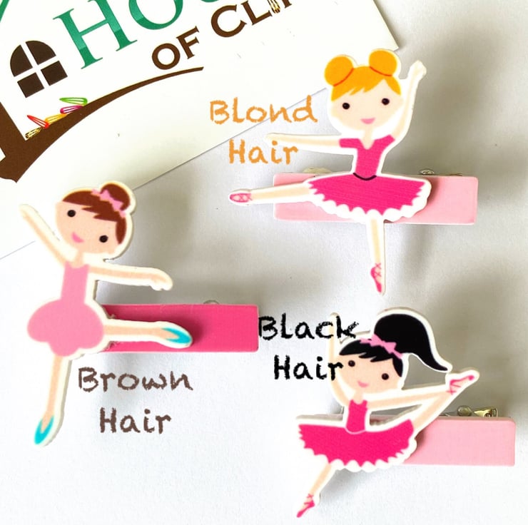 These pink ballerina hair clips are sure to put a smile on any little ballerina s face. There are three different designs of ballerina to choose from: blond, brown and black haired!