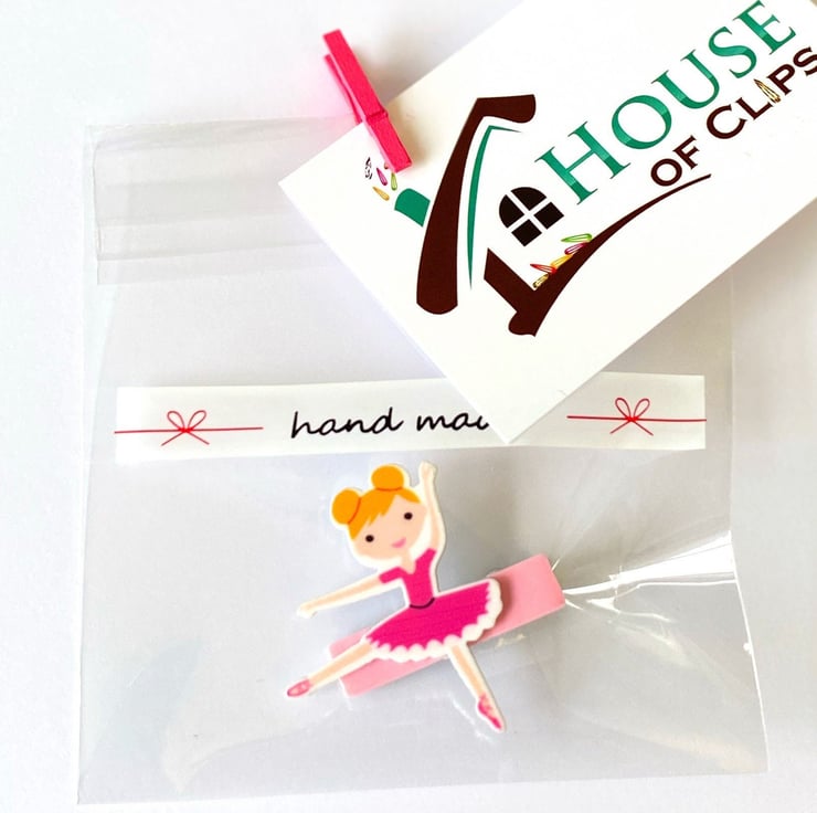 All of my ballet hair clips arrive in a pretty cellophane bag, decorated with a peg and business card. Placed into a metallic protective envelope which I then like to decorate with fun stickers. Making your parcel something to smile about when it drops through your letter box!