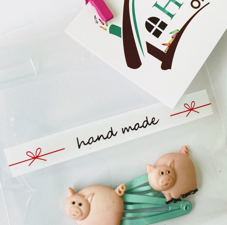All of my farm hair clips arrive in a pretty cellophane bag, decorated with a peg and business card. All placed into a metallic protective envelope. Making your parcel something to smile about when it drops through your letter box!