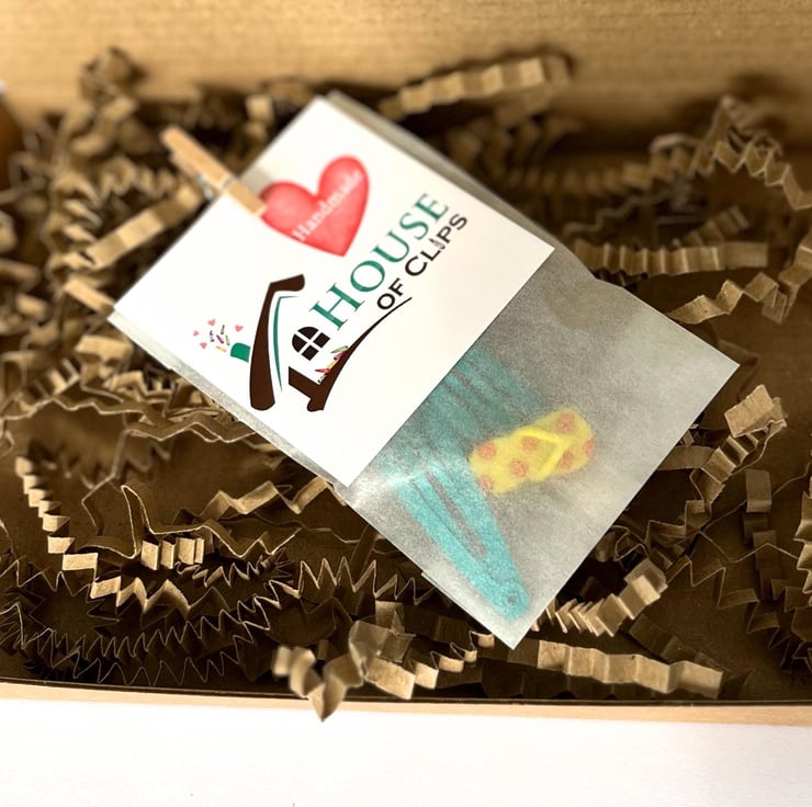 The summer snap clips arrive beautifully packaged in a small kraft box; protected in recycled kraft paper that is topped with a sticker plus a pegged business card. Receipts are included on recycled paper unless a gift note is requested
