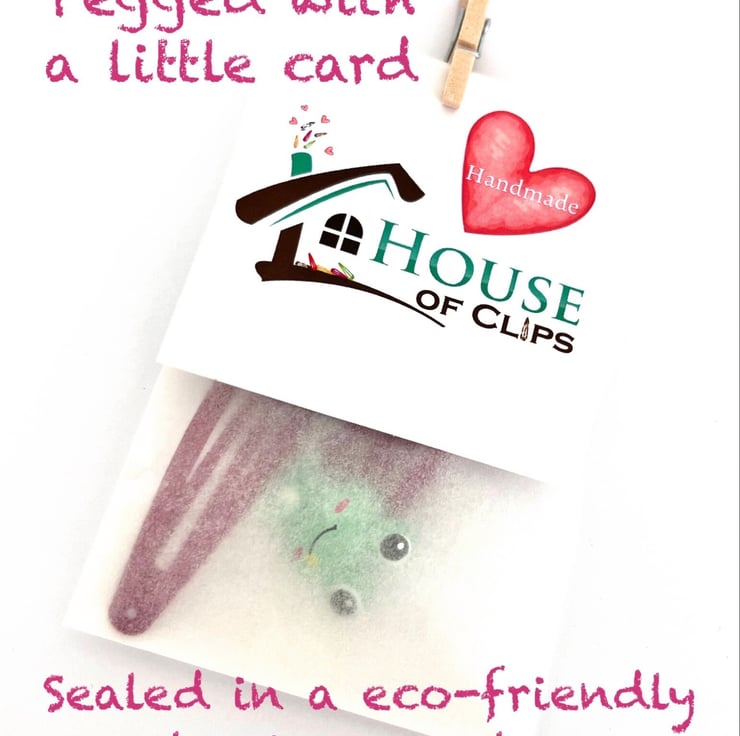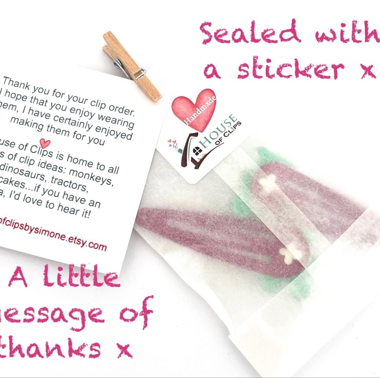 All of my clips arrive sealed in an eco-friendly gift bag; pegged with a little thank you card. This is nestled into lavender scented shredded paper and placed into a protective Kraft letter box x