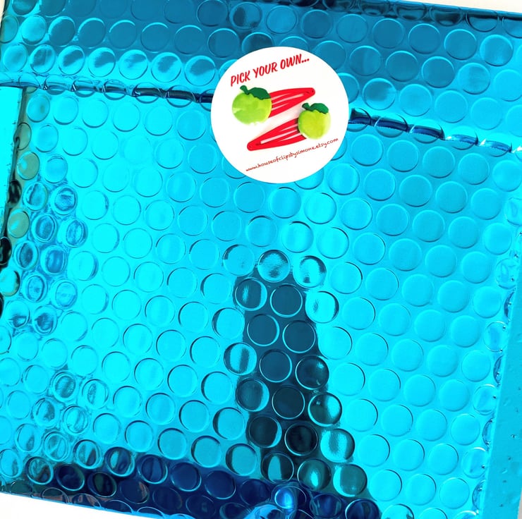 Theses fun Halloween hair clips arrive in a Handmade cello bag with a house of Clips card and sticker, attached with a tiny peg. All clips are placed in a bright metallic envelope making it the best Halloween present
