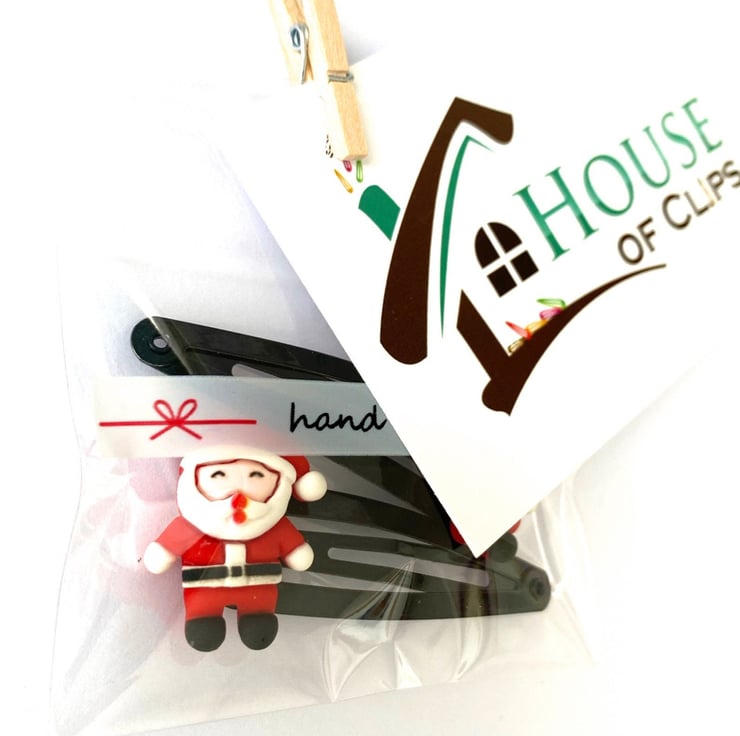 All of my Xmas hair clips arrive in a hand-made printed cellophane bag sealed with a house of clips festive sticker; decorated with a peg and business card all placed into a metallic protective envelope.